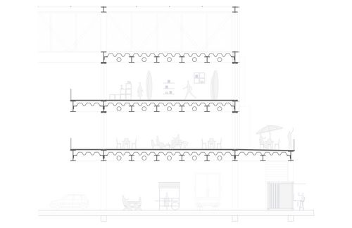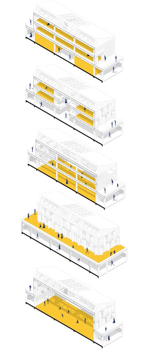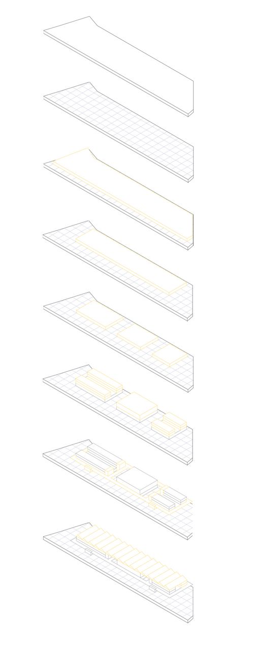 L'aboutissement de ce travail est la création d'une halle de 7 000m2 à programme mixte accueillant à la fois pêcheurs, touristes, commerçants, citadins. Pour abriter une mixité de programme et répondre aux besoins de la ville et de ses habitants, la grande halle se décompose en 3 entités, dissociée par des failles : la halle commerciale, la halle événementielle, et la halle industrielle. L'architecture a pour ambition de se transformer continuellement, en évoluant aux rythmes de la ville, de ses saisons et de ses évènements. Elle peut alors servir de lieu de marché le samedi, se transformer le temps d'un week end pour accueillir un salon nautique, ou même devenir un parking l'été.