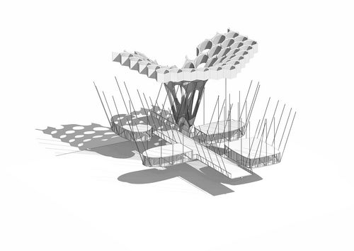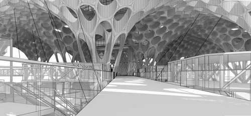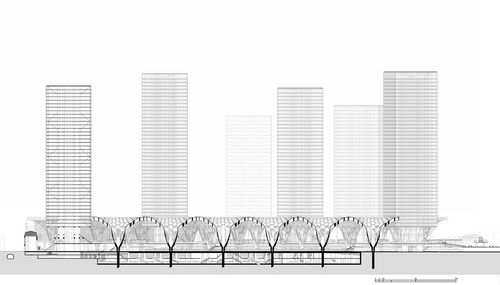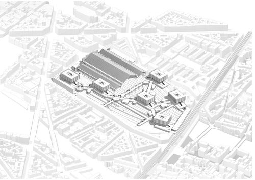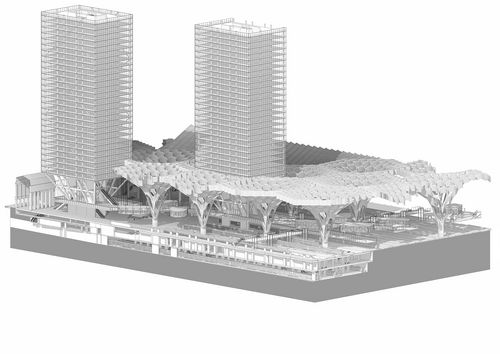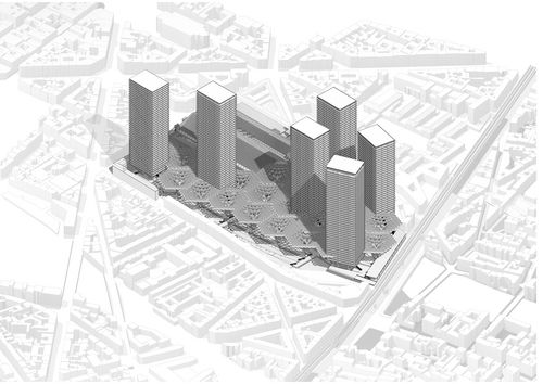 Reprenant l'exemple de la gare de Shibuya, un nouveau quartier de grandes hauteurs s'inscrit sur la gare du Nord dans une volonté d'amplification et d'un faire un lieu de destination. Celui-ci est construit sans recouvrir totalement la gare par une dalle, laissant l'activité ferroviaire visible. Une canopée comme élément centrale unificateur liant les diverses fonctions et usagers permettant d'étendre la gare au-delà de sa verrière historique et de ses espaces souterrains. Cette grande canopée porte les divers éléments de circulations donnant l'impression d'avoir une ville flottante sur la gare et un nouveau ciel protecteur. Les flux sont mis en exergue avec un dialogue et un contraste direct entre les trains, les passagers, les autres usagers. Un contraste entre modernité expressive et une partie historique conservée.