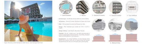 L'hôtel du Saint Georges appartenant au " quartier des hôtels " sur le front maritime fut témoin de l'Âge d'or du Liban. Il rayonnait sur la scène locale et internationale. Cependant, en 1976, il participe à un épisode de la guerre, " la bataille des hôtels ", dans laquelle se sont affrontés les combattants depuis les différents hôtels pris d'assaut. Une fois la guerre achevée, c'est à SOLIDERE (acronyme de société libanaise de reconstruction) qu'est confiée la reconstuction du centre ville et du front maritime beyrouthin en 1994.