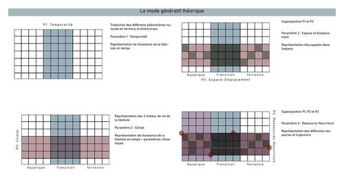 Mon choix s'est porté sur la libellule afin d'étudier son comportement, ses différentes interactions et de les analyser dans le temps et dans l'espace ce qui va permettre de développer un algorithme. Cet algorithme facilite ensuite la création de modèles génératifs, qui servent de passage entre l'étude de l'organisme et la conception du projet. Ce mode génératif s'appuie sur quatres paramètres : la temporalité, le climat, l'espace et la ressource. De plus, l'un des aspects essentiels de ce projet est la préservation de la biodiversité existante. Ainsi, lors de la conception des pavillons, une attention particulière sera accordée à l'intégration des espaces naturels. Le projet sera donc composé avec la végétation existante. En conclusion, ce projet architectural de pavillons sur pilotis représente une réponse pérenne face aux défis posés par la revitalisation d'un patrimoine culturel, les enjeux naturels tels que les crues et la préservation de la biodiversité.