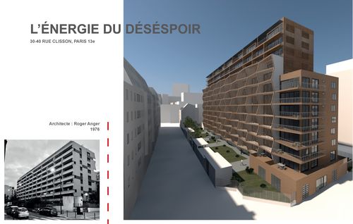 Le projet proposé aux étudiants.es consiste en la rénovation durable, à caractère notamment énergétique, et en la densification (surélévation et/ou extension) d'un ensemble immobilier de 1976, représentatif du patrimoine " domestique " de la seconde moitié du XXème siècle, d'environ 14 500 m², comprenant 112 logements collectifs répartis en 2 bâtiments accolés, sur un terrain de 2 497 m2 à Paris 13ème, implanté au 30 à 40 rue Clisson, et situé dans un secteur urbain assez hétérogène et de densité variable. Le projet s'inscrit dans les thématiques " CONTEXTUALISER " et " TRANSFORMER ", retenues, l'une et l'autre, pour la 3ème année de licence (L3) et son semestre d'automne (S5), dans le programme réformé de l'ENSAPVS, en s'attachant à un programme d'une actualité brûlante, avec la volonté d'initier les étudiants.es à la pratique du projet sous certains de ses aspects opérationnels (méthode de travail, techniques de construction et de rénovation, insertion dans le réel, etc.), c'est-à-dire de rendre la réalité du construire motrice de la conception et non simple conséquence.
