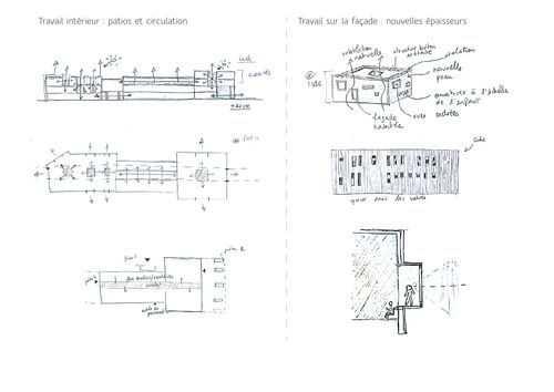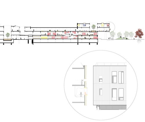 Coupe Longitudinale 1/200 et détails de façade au 1/50, Un dialogue entre la façade et les petites boîtes à l'échelle de l'enfant