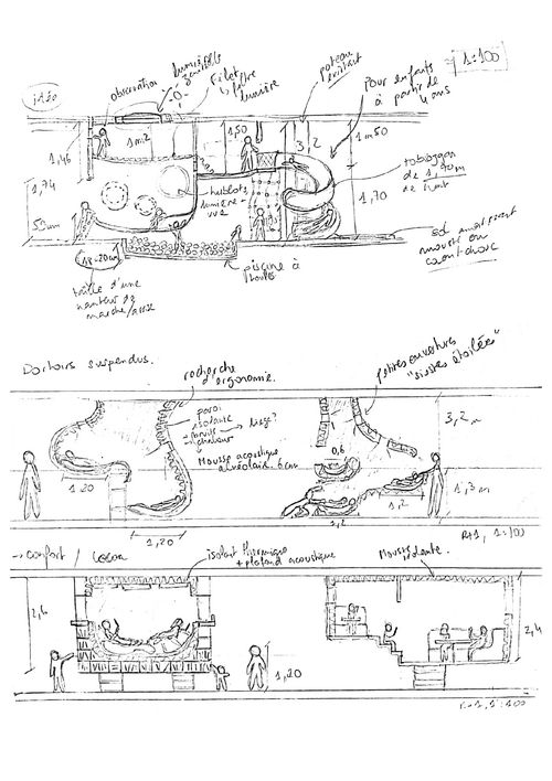 Croquis, boîtes suspendues pour jouer, lire et dormir : des petits univers adaptés aux enfants