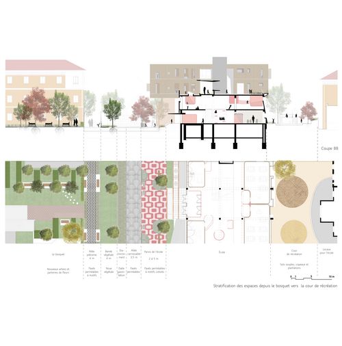 Coupe transversale 1/200, Stratification des espaces depuis le bosquet vers la cour de récréation