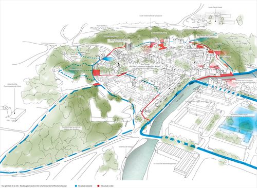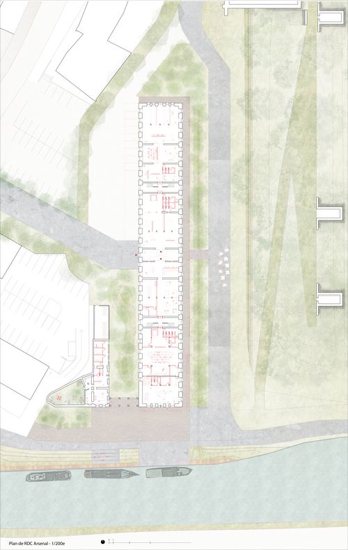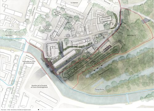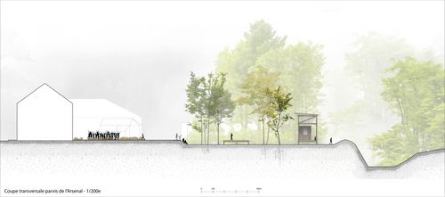 Guidée par une volonté forte de mise en valeur du patrimoine matériel et immatériel, cela a fait émerger différentes orientations de projet que ce soit en termes d'usage, d'interventions sur le bâti existant ou encore de paysage. Il s'agit ainsi, au travers différentes échelles, de rendre d'une part lisible et appropriable les remparts mais également d'ancrer l'Arsenal dans le tissu urbain et la mémoire collective.