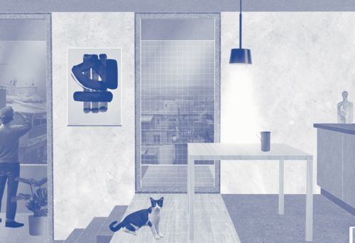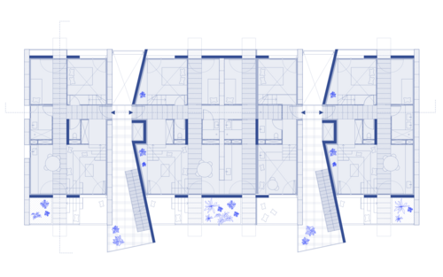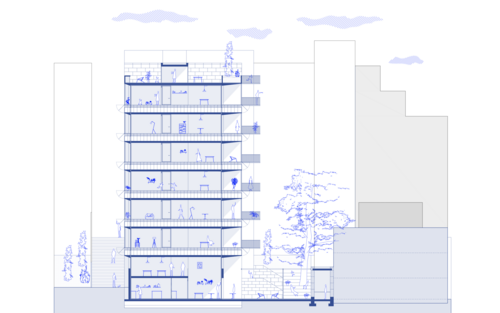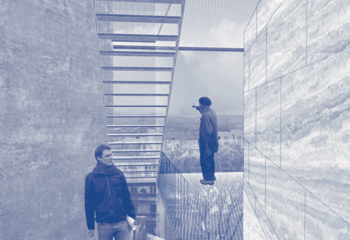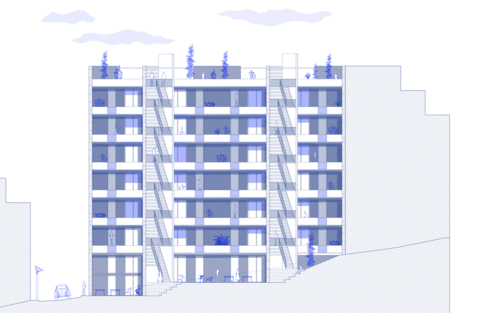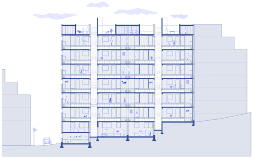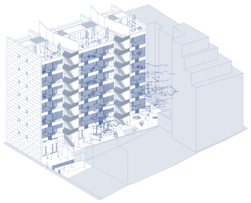 Il s'agit donc pour ce projet de réinterpréter ce que qui constitue l'essence du logement grec en le transposant dans le contexte contemporain. En été, des vents du nord balayent la ville d'Athènes et c'est autour de ces mouvements d'air que l'immeuble proposé est imaginé. Le bâtiment devient une architecture aéraulique en canalisant l'air par des failles qui accueillent les circulations communes. Par des canaux de fraîcheur en pierre locale, chaque logement se connecte à ces interstices qui grâce à l'effet Venturi nourrit des mouvements d'air lorsque le système est ouvert la nuit. Par l'inertie thermique et la notion de déphasage, les canaux de pierre retransmettent la fraicheur accumulée durant la journée.