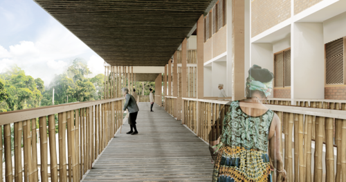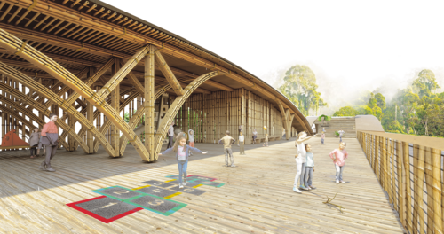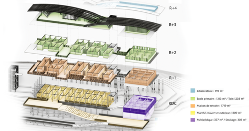 Le réaménagement a été pensé avec des matériaux locaux, tel l'utilisation : de bois locaux ; du bambou pour les menuiseries et la structure organique de la charpente de la toiture. Ainsi que la brique de terre crue. Au rez-de-chaussée, il y aurait un grand marché. Au premier étage, une maison de retraite. Au second étage, une école primaire, afin de répondre au manque d'école en Guyane. La toiture terrasse du bâtiment serait amenée à accueillir la cour de récréation de l'école primaire et elle aurait pour double fonction d'être un observatoire au sommet de la colline.