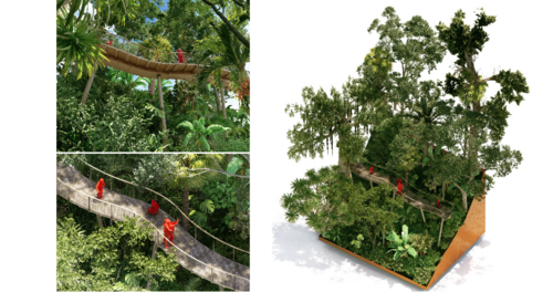 Projet urbain : Sur la colline de Montabo, il y a un sentier très connu, qui est "le sentier de Montabo". Ma première intervention sur le site, consiste à compléter ce sentier en permettant un parcours à travers les arbres. Pour protéger les arbres, le parcours se ferait sur des grandes passerelles en bois sur pilotis, qui viendrait se frayer un chemin dans la forêt tout en préservant les écosystèmes.