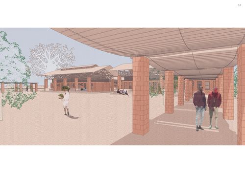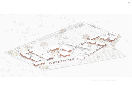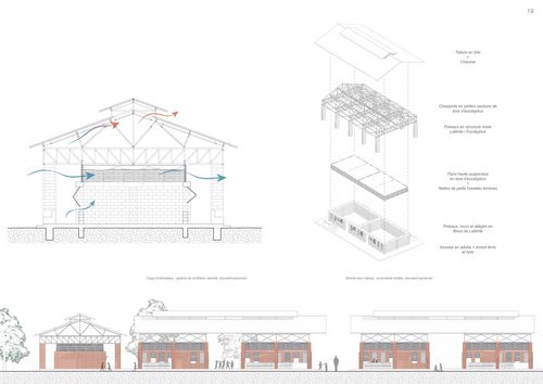 Des passages couverts permettent de se déplacer en étant protégé du soleil, et on trouve sur la parcelle plusieurs espaces végétalisés où il sera possible de tester différentes techniques de revitalisation des sols.La construction du projet se base sur l'utilisation du bloc de latérite, excellente source de masse thermique, et les charpentes surélevées en petites sections d'eucalyptus permettent d'assurer un bon confort thermique tout au long de la journée.