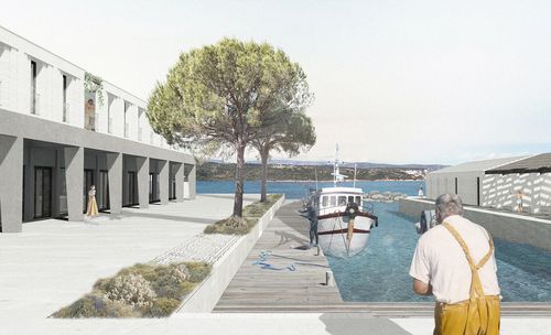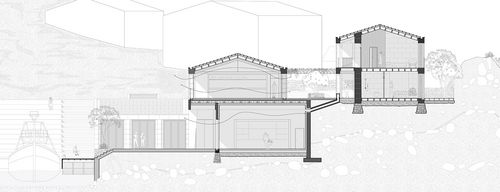 L'implantation du projet divise les entités du programme de manière à conserver des espaces publics au niveau de la mer et des espaces privés au niveau de la route, articulés entre eux au moyen de coursives extérieures.