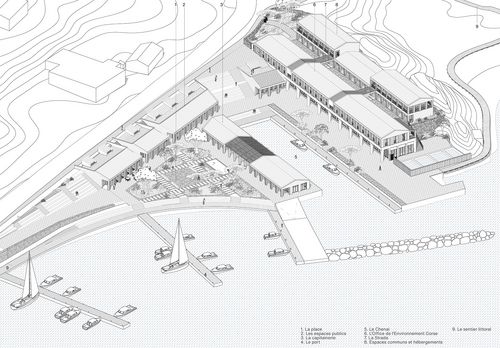 Le projet se développe autour de trois axes programmatiques : la base de l'Office de l'Environnement Corse, une capitainerie, ainsi qu'une place publique bordée de commerces et d'espaces culturels.
