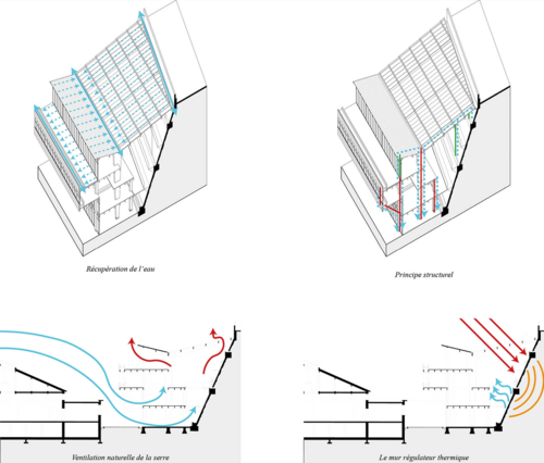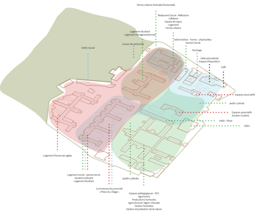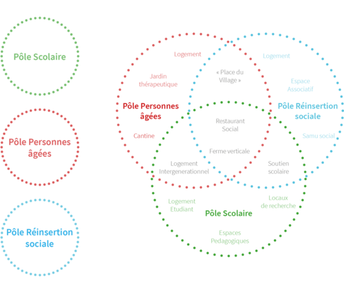 Pour se faire j'ai traité le sujet de l'agriculture urbaine. Elle se manifeste à travers un programme à trois thèmes : les personnes âgées, la scolarité, et la réinsertion sociale. Ces trois entités et leurs interactions permettent d'habiter l'ensemble du site.