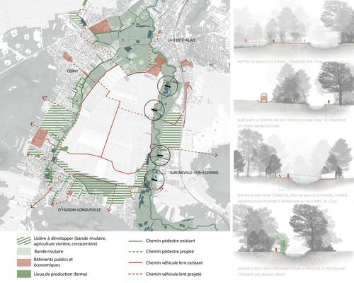 Ce projet situé en Essonne, s'inscrit dans un territoire péri-urbain, qui dû à sa proximité avec Paris subit aujourd'hui une croissance démographique engendrée par un exode urbain. Mais c'est aussi un territoire situé dans un espace largement agricole et naturel qui s'est développé le long des cours d'eau créant un lien entre les communes étudiées : La-Ferté-Alais, Cerny, D'Huison-Longueville, Baulne et Guigneville-sur-Essonne.