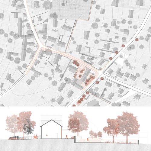 La place de la mairie , orienter la mairie vers le centre-bourg - plan et coupe