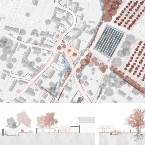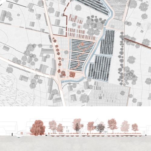 Cette notion d'archipel a été définie tout au long de ce projet avec pour appui le concept des lisières comme outil pour le projet. Afin de développer cette réflexion à toutes les échelles, ce projet a ensuite été développé plus précisément sur la commune de D'Huison-Longueville, devenue le support de l'application du principe des lisières. La question de l'accès à la bande rivulaire, liant les communes de l'archipel, a ainsi été posée, en proposant la création de portes d'entrées ouvrant l'espace public sur cette bande en développant trois lieux, publics : la place de la mairie, le jardin du cresson et la place du lavoir.