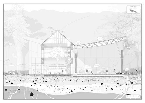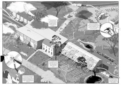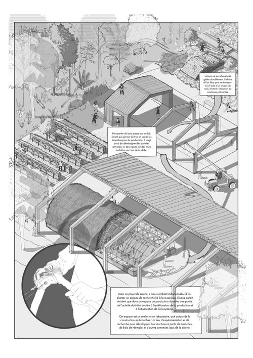 Pour ce projet, nous avons imaginé deux sites de production de bois. Le premier est une réhabilitation d'une "méga-scierie" industrielle en lisière de la forêt d'Orléans. Une réhabilitation qui permet d'adapter le site à un usage modéré et consciencieux du bois. Le deuxième est une usine de recyclage de déchets verts, notamment de branches issues de l'élagage, permettant la fabrication de structures à base de branches et petites sections de bois. Un projet permettant de court-circuiter le cycle habituel des déchets du bois.