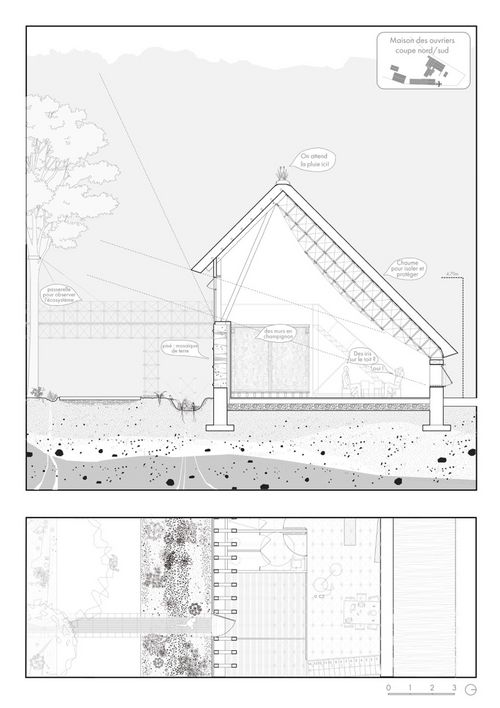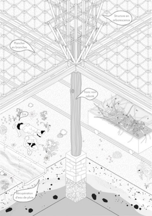 Nous avons alors proposé un projet mêlant une dimension paysagère, qui traite l'état de la forêt, architecturale, en proposant des bâtiments frugaux respectant le sol et la ressource et finalement expérimentale, en travaillant avec des prototypes à échelle 1, nous permettant d'appréhender la matière et proposer des structures innovantes en branches.