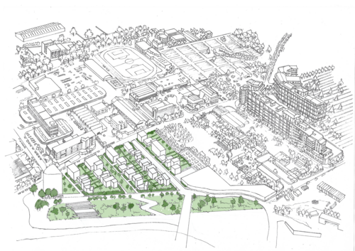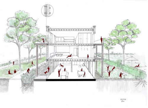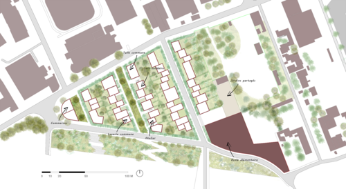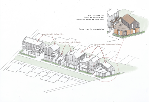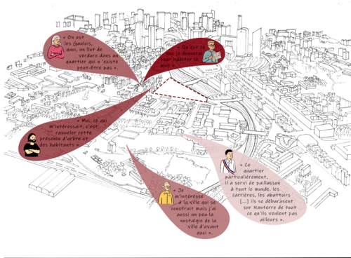 La multiplicité des acteurs et des mémoires sensibles à l'œuvre mis en exergue à partir d'entretiens d'intervenants variés vient interroger leur prise en compte dans le projet. La volonté est alors de concevoir avec l'existant et de s'inspirer de l'essence des Groues et de ses habitants pour construire un lieu qui s'intègre à la fois dans son environnement proche, notamment avec le tissu pavillonnaire de l'avenue Jenny et son esprit de voisinage mais aussi au reste de la ville afin d'attirer une population mixte et hétérogène, à l'image de Nanterre. La mixité des typologies de logements et les activités proposées sont pensées en adéquation avec la sociabilité des Groues et ses futurs résidents, afin de favoriser une vie sociale dans un contexte actuellement peu résidentiel.