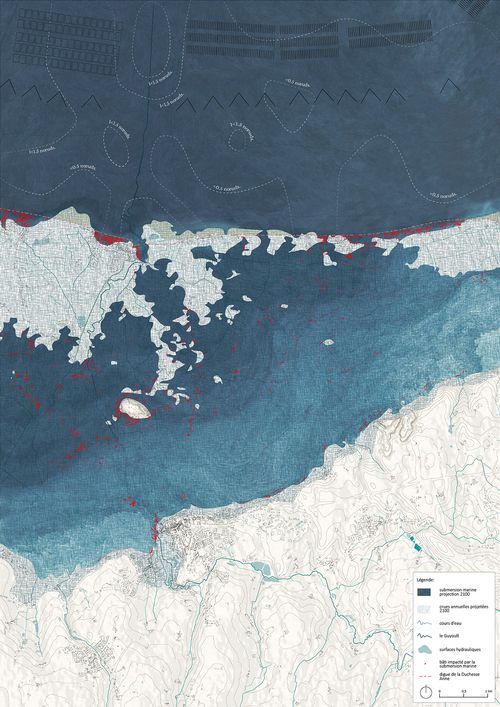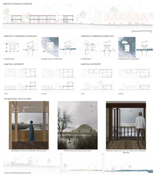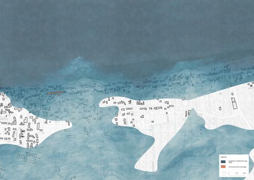 Ce projet de fin d’études traite de l’accompagnement des habitants dans un processus de déconstruction et reconstruction de leur habitat, face au risque de submersion marine. À travers l’entraide, le réemploi des matériaux et l’intérêt porté aux cultures constructives locales, nous cherchons à lutter contre le violent déracinement caractéristique des projets de délocalisation en maintenant une attache au village d’origine. L’enjeu de ce double projet vise à recomposer l’habité en tenant compte de l’existant, du devenir d’une zone d’activité, de proposer et d’accompagner de nouvelles manières de vivre ensemble à l’horizon 2100.