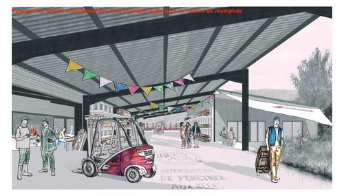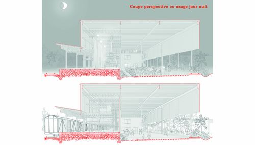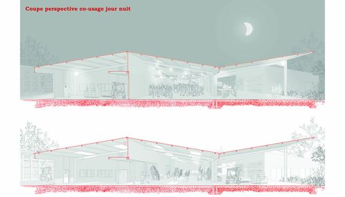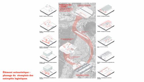 Ce travail nous a dirigé vers la nécessité de mobiliser nos capacités de projection et d’imagination et a ainsi induit la posture suivante : celle d’auteur·ice d’une histoire autre que celle de la construction de l’autoroute, de concepteur·ice d’espaces. Ainsi, au cœur des sites clés de la région menacée, nous avons imaginé un récit. Cette proposition ne se lit pas dans la confrontation avec la menace mais dans l’alternative, la bifurcation. Elle prend pied dans les réalités physiques des infrastructures présentes sur le territoire, et s’appuie sur une enquête auprès des militant·es, élu·es et habitant·es de la région pour les animer dans une fuite en avant, en dehors des préoccupations capitalistes et mondialisées du monstre-autoroute qui projette son ombre sur les vallées et les plateaux à l’Est de Rouen.