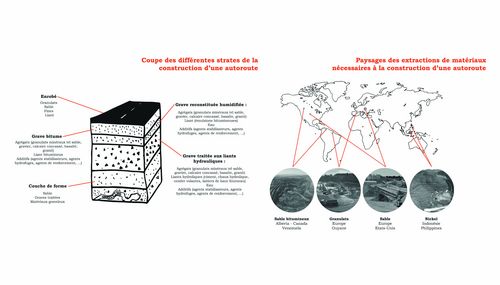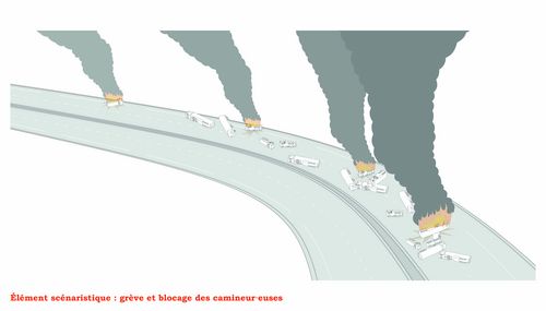 Tout d’abord, nous avons exploré la posture d’enquêteurs et d’illustrateurs en réalisant des documents de sensibilisation. Ceux-ci représentaient les risques de la construction d’une autoroute sur le territoire rouennais. Ils mobilisaient les capacités de représentation de l’architecte.
