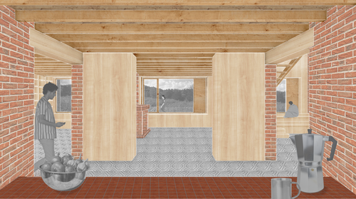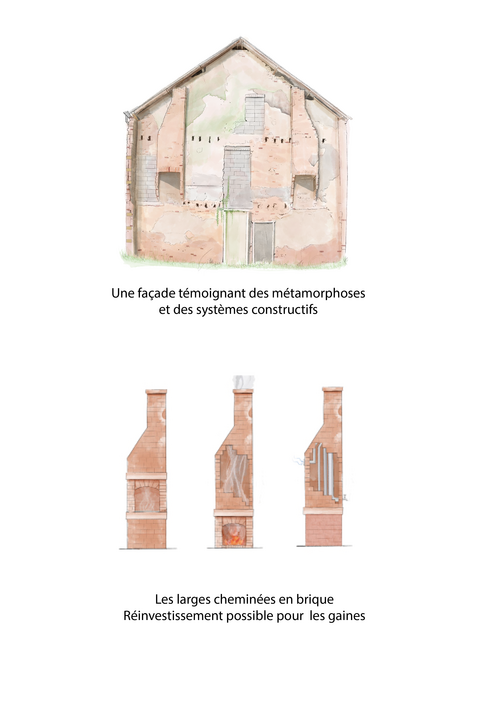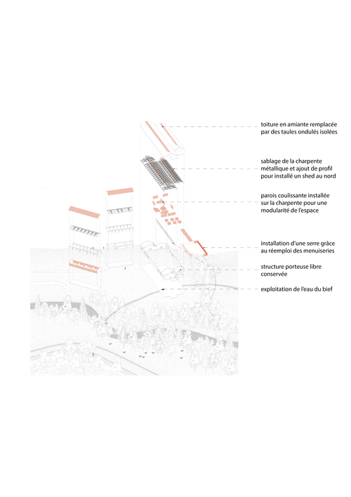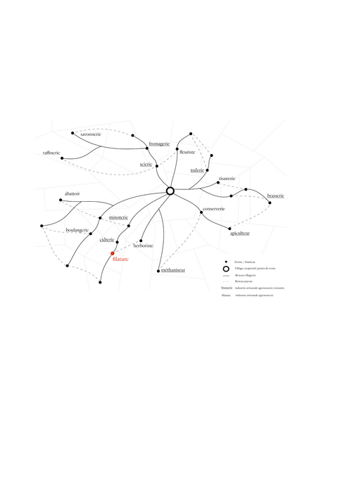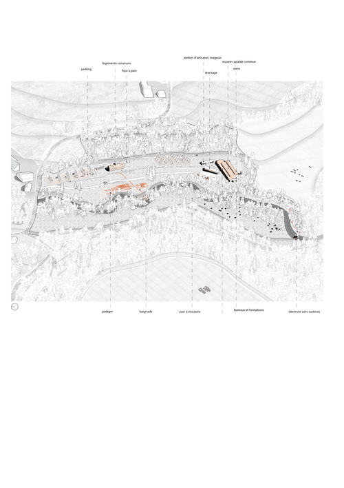 Ainsi, pour préciser le rôle de l’architecte dans la réhabilitation de lieux et de liens j’ai été amenée à m’intéresser à une friche industrielle située dans une vallée boisée, à la limite d’un hameau. Dans une démarche réhabitante et productive, j’ai tenté de construire un schéma du modèle type en abordant ce site comme un cas d’étude. Puis par un heureux hasard, j’ai rencontré les nouveaux propriétaires des lieux, un groupe d’une vingtaine de personnes qui s’installent pour vivre en communauté. Ils prévoient d’utiliser les ressources du site pour pratiquer la permaculture et se reconnecter au réseau commerçant local.