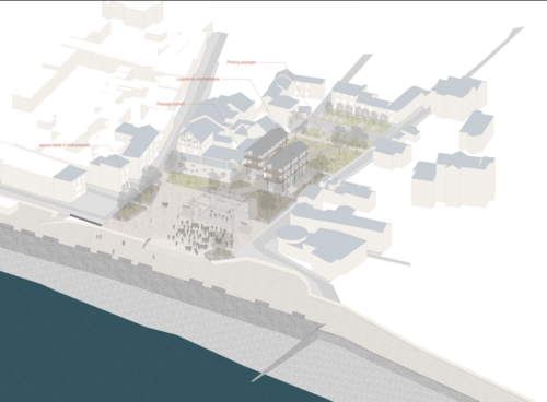 3. Transformation urbaine et architecturale : Conversion du grand parking Charles de Gaulle en une place publique et des logements. La place sera une extension de la promenade, avec des gradins, des fontaines et des espaces pour événements, entourée de logements et de commerces. Des espaces arborés, un parking à vélos et des zones pour les habitants seront également créés.