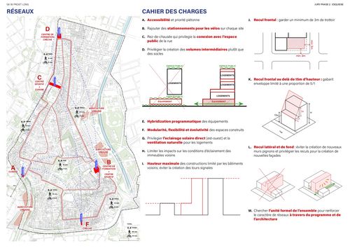 Le projet s'appuie sur un système méthodologique articulé autour de trois axes : la création d'une stratégie constructive, la formulation d'un cahier des charges urbain et architectural, et le développement d'une étude typologique des usages proposés. L'approche systématique garantit que les interventions architecturales et urbaines participent à une vision globale de redynamisation urbaine en réseaux, plutôt que de résoudre des problèmes de manière isolée. Au final, parmi les cinq sites sélectionnés pour le réseau, deux ont été choisis pour le développement du projet présenté dans ce travail.