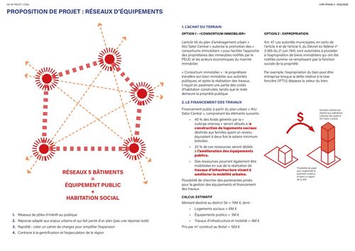 Ce projet propose la création d'un réseau de cinq bâtiments réunissant équipements publics et habitations sociales. Aligné avec les intérêts des mouvements sociaux, ce réseau cherche une nouvelle façon d'occuper le territoire de manière plus juste et égalitaire. Chaque bâtiment du réseau est conçu pour servir de nœud vital, connectant les habitants et leurs luttes aux dynamiques de la vie urbaine. Cette approche vise à promouvoir l'inclusion sociale et l'égalité d'accès aux ressources urbaines, tout en répondant aux besoins de la population en matière de logement et de services publics essentiels.