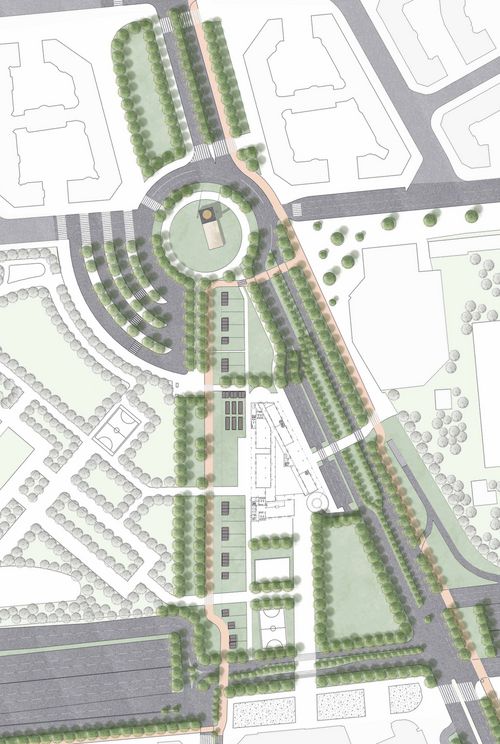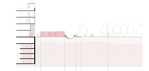 En premier, la question urbaine, se concentre sur la pose d’un tablier urbain, une refonte de la voirie dédiée aux véhicules afin de permettre une ouverture aux mobilités douces. Ensuite sur la question de la ceinture verte, la transformation du parking souterrain s’impose en le réhabilitant en entrepôt, du dernier kilomètre en son emprise. Une continuité piétonne et cyclable est pensée afin de relier le square et le centre sportif. Enfin à l’échelle architecturale, l’élévation sur l’ancien parking devenu entrepôt, par l’implantation d’un ERP constitué d’un bar associatif, des ateliers d’artisanat, des jardins partagés, des locaux pédagogiques et une partie dédiée aux espaces de co-working afin de redynamiser cette place.