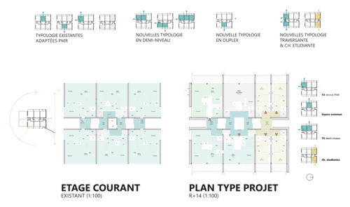 La réhabilitation de la Tour a permis également de repenser la manière d'habiter une tour de logements. De nouvelles typologies de logements ont été mises en place, afin de proposer un programme mixte. Initialement inaccessible aux 2/3, la Tour a complètement été mise à niveau PMR, y compris les logements (chambres étudiantes, T2 T3 T4 T5 et T6).