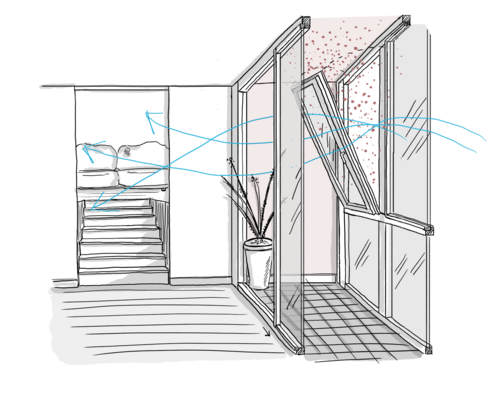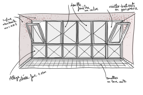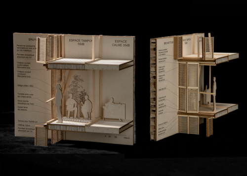 Un dispositif de façade épaisse a été installé afin de repenser le logement victime de nuisances sonores. La typologie de la loggia agit ici comme la réponse architecturale la plus adaptée en contexte bruyant. Elle sert d'espace tampon pour filtrer les sons avant d'entrer dans le logement.
