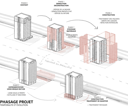 Une déconstruction sélective a été mise en place pour favoriser les filières de réemploi. La zone sous le périphérique sert de stockage et devient une usine éphémère de briques recyclées. Les nouvelles briques produites permettront par la suite de construire un petit équipement de quartier au pied de la Tour : un café librairie, afin de redynamiser la zone.