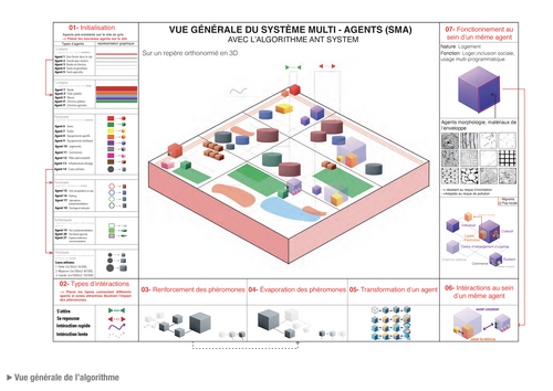 Mon projet de fin d'études applique ces enseignements pour créer des environnements inclusifs et résiliants à Fos-sur-Mer, en intégrant les migrants clandestins et en gérant les risques environnementaux. En utilisant le mode génératif et le système multi-agent, basé sur l'algorithme Ant System, je modélise les interactions urbaines pour favoriser une continuité urbaine adaptable aux besoins des populations vulnérables. Le projet intègre une dimension éthique et participative, impliquant migrants, résidents locaux, autorités municipales et acteurs de la société civile. Inspiré par les travaux de Saskia Sassen, il vise à créer un environnement urbain diversifié, dynamique et inclusif, avec des espaces publics accueillants, des logements abordables et des infrastructures accessibles.