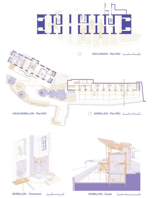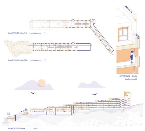 Notre projet s’oriente selon trois axes de réflexions majeurs : les espaces publics, les futur.es habitant.es et l’organisation et la gestion des rebuts de chantier. En effet, puisque l’accessibilité à ce site est extrêmement complexe cela rend l’acheminent de matière pour le chantier de réhabilitation difficile et la redescente également. Nous nous interrogeons donc sur la manière de réemployer, de réutiliser et de revaloriser les matériaux déjà présents sur site, dans l’espace public.