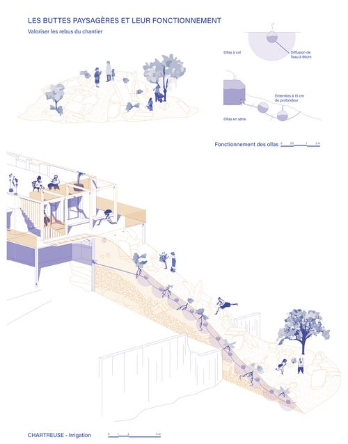 Par exemple, des buttes paysagères, constituées des vestiges du chantier, deviendraient un terrain d’étude sur le réensauvagement possible de ce genre de rebuts. Agencées de manière stratégique, elles peuvent permettre d’aider au cheminement à travers le site ou encore à concevoir des assises, etc.