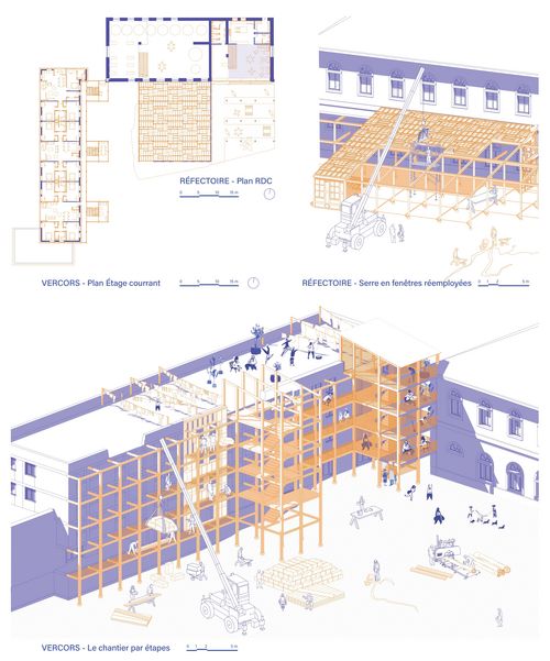 Comme décrit sur l’axonométrie, nous proposons un programme mixte entre l’accueil de populations précaires dans des logements collectifs d’habitat alternatif, l’activité associative et culturelle permettant de lier le site à la ville, et celle touristique en créant un certain nombre de lits d’auberge de jeunesse alliée au développement d’une activité agricole à l’arrière de la parcelle.