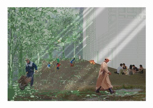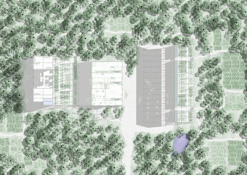 C’est au milieu de cet espace refuge que prend place l’ancien silo, lieu de stockage peu animé et saisonnier. Finalement, c’est une oasis qui prend forme, l’ancien silo devenant un lieu de vie annuel profitant de l’ombre et la fraicheur ambiante, lieu de production et de commerce pour la population locale. Un bâtiment où l’humain ne rentrait que pour la maintenance est réhabilité en un espace investi par l’être humain. Si le silo avait pour vocation de protéger les récoltes du climat extérieur, désormais l’oasis s’appuie sur des éléments tels que l’eau, l’ombre, le vent, pour vivre.