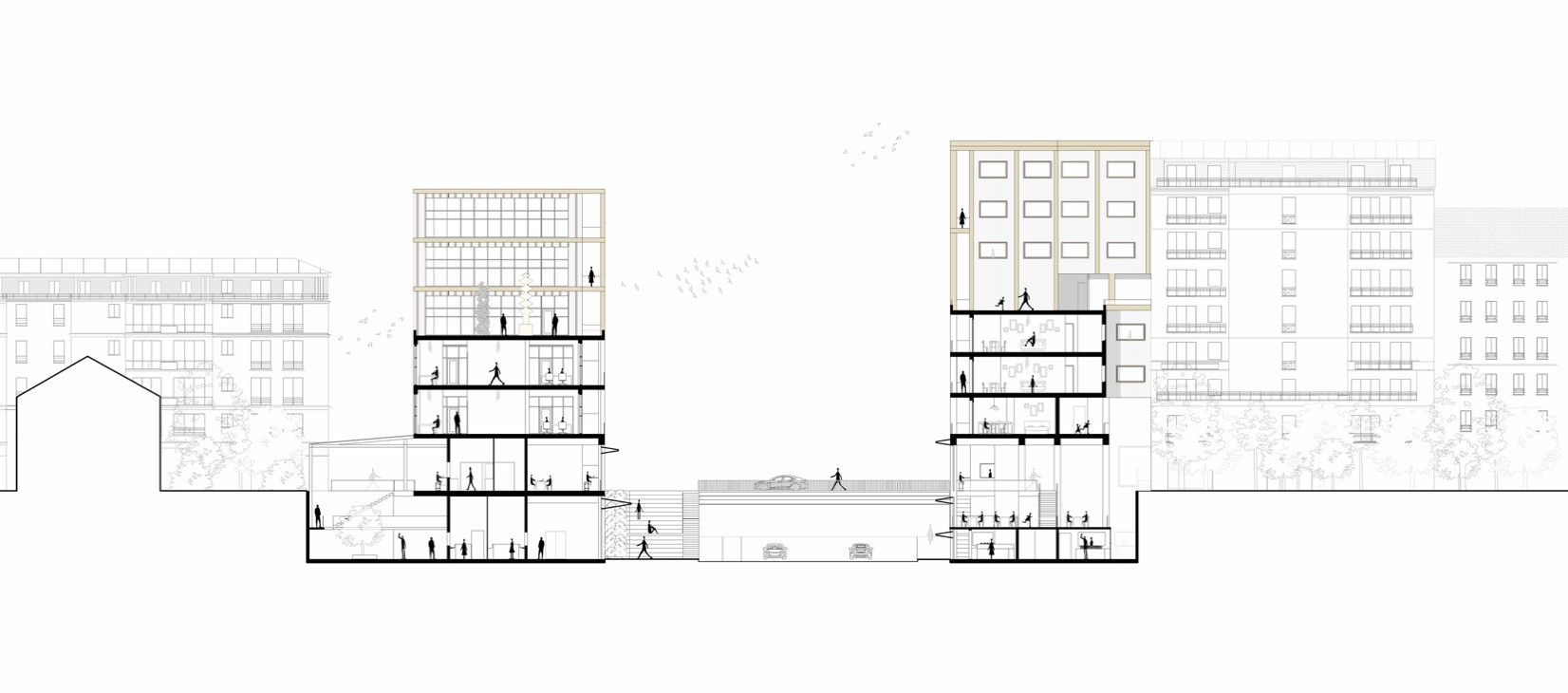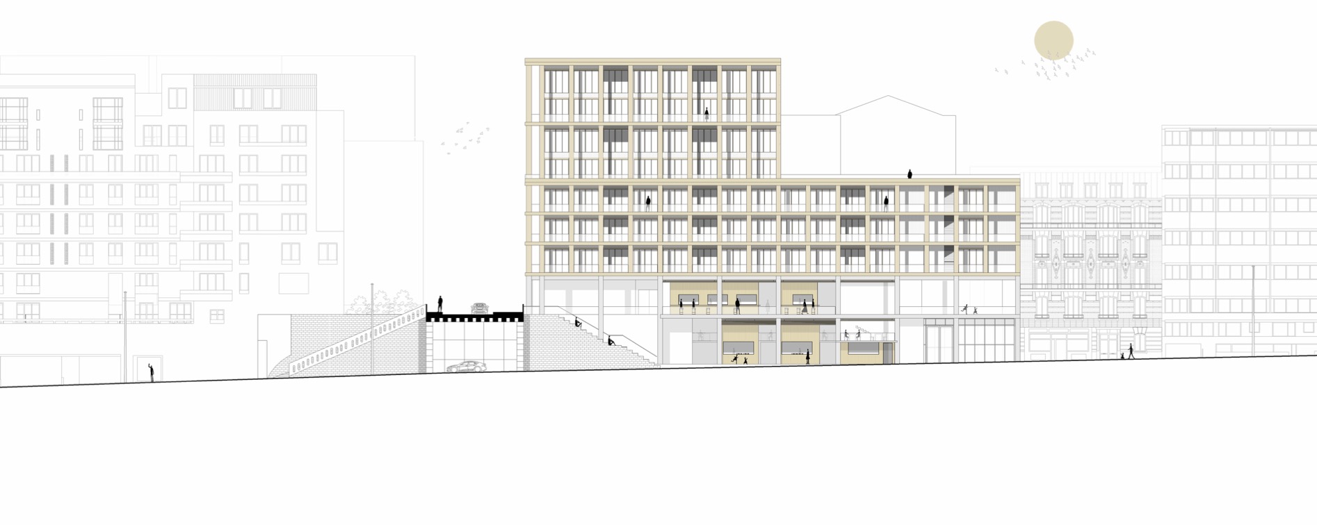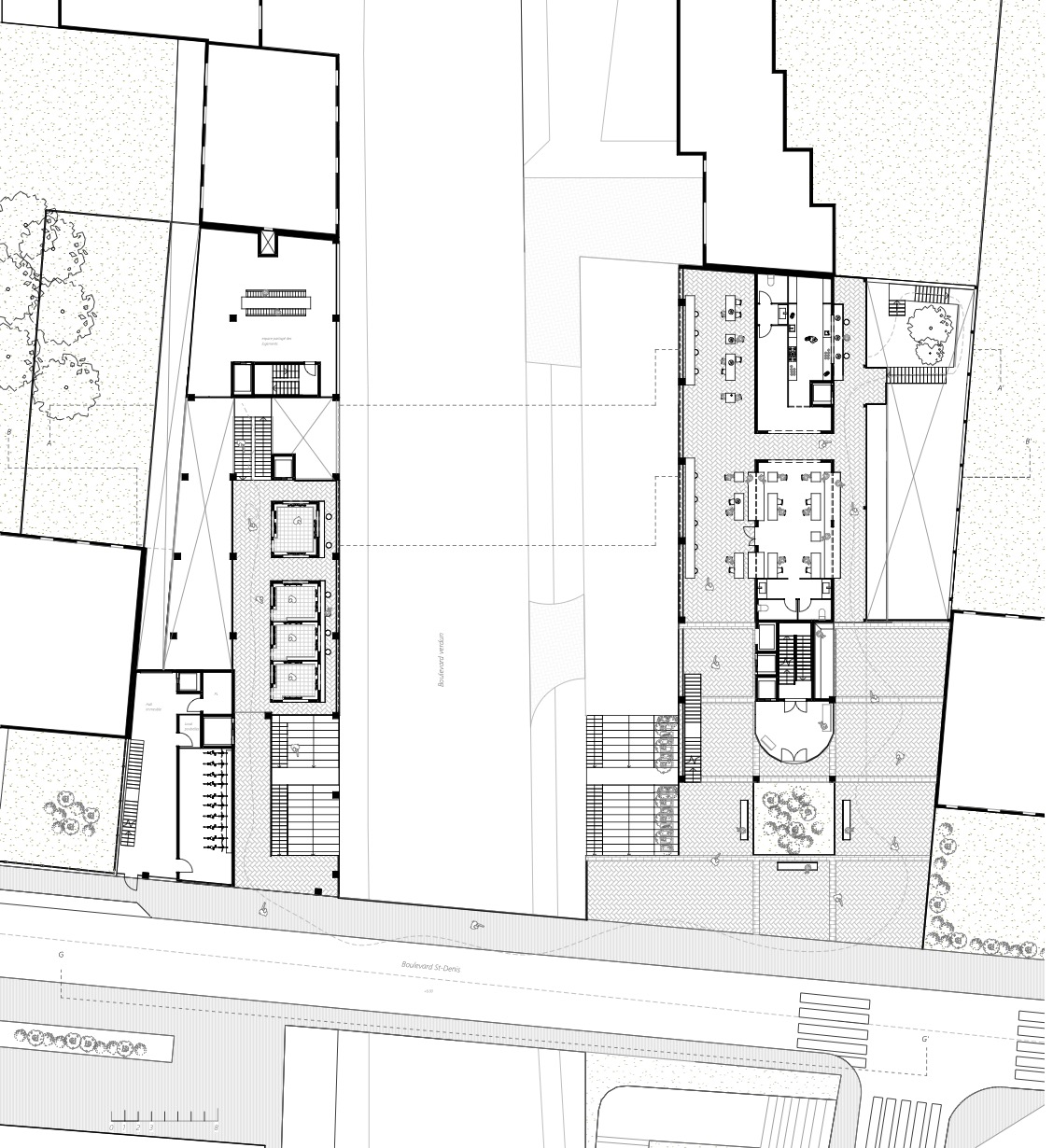 Mon projet de fin d’études se situe à Courbevoie, au croisement du boulevard Verdun et du boulevard Saint-Denis, dans un secteur marqué par une particularité forte : deux niveaux de ville superposés. Cette configuration crée un enjeu urbain essentiel, celui de repenser les rez-de-chaussée et de trouver une manière de les relier et de les activer. Mon projet répond à cette condition en proposant une architecture qui articule un socle public et deux volumes bâtis complémentaires. Le socle accueille un marché déployé sur les deux niveaux et réparti sur les deux parcelles, de part et d’autre du boulevard. Ce marché devient un lieu vivant, favorisant les circulations horizontales et verticales, et s’ouvrant aussi bien à des stands alimentaires qu’à des espaces de restauration et des terrasses. Au-dessus, deux bâtiments « faux jumeaux » dialoguent : à gauche un immeuble de logements, à droite un immeuble de bureaux. Conçus en bois, ils se distinguent du socle en béton et s’inscrivent dans le tissu urbain existant, tout en affirmant leur rôle de signal depuis le boulevard. Ce projet transforme la contrainte initiale du site en opportunité, en imaginant une multiplicité de rez-de-chaussée connectés et actifs. Il propose ainsi une nouvelle manière de vivre et de parcourir cette section du boulevard Verdun.
