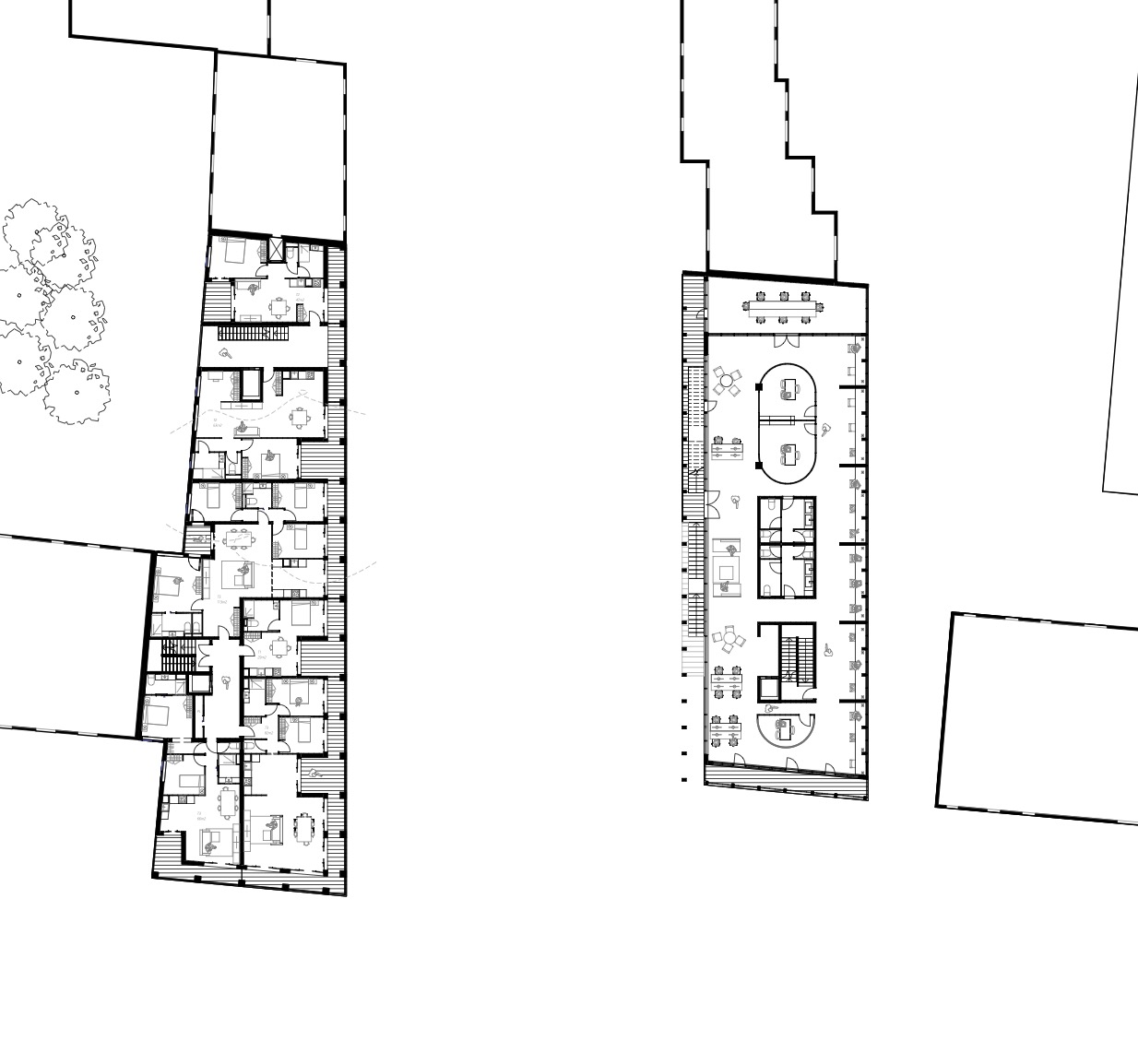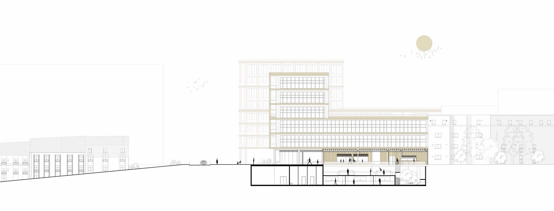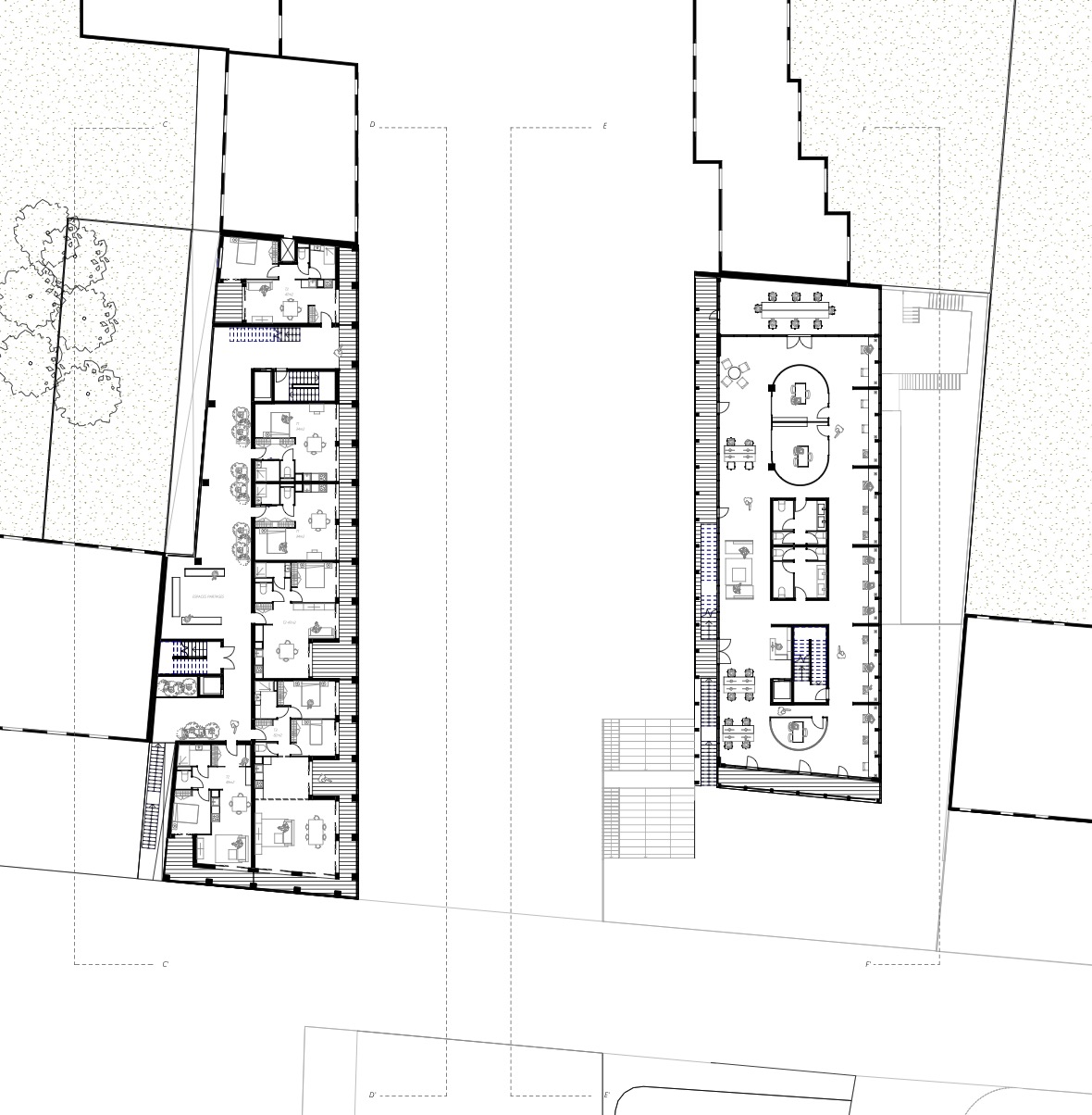 Mon projet de fin d’études se situe à Courbevoie, au croisement du boulevard Verdun et du boulevard Saint-Denis, dans un secteur marqué par une particularité forte : deux niveaux de ville superposés. Cette configuration crée un enjeu urbain essentiel, celui de repenser les rez-de-chaussée et de trouver une manière de les relier et de les activer. Mon projet répond à cette condition en proposant une architecture qui articule un socle public et deux volumes bâtis complémentaires. Le socle accueille un marché déployé sur les deux niveaux et réparti sur les deux parcelles, de part et d’autre du boulevard. Ce marché devient un lieu vivant, favorisant les circulations horizontales et verticales, et s’ouvrant aussi bien à des stands alimentaires qu’à des espaces de restauration et des terrasses. Au-dessus, deux bâtiments « faux jumeaux » dialoguent : à gauche un immeuble de logements, à droite un immeuble de bureaux. Conçus en bois, ils se distinguent du socle en béton et s’inscrivent dans le tissu urbain existant, tout en affirmant leur rôle de signal depuis le boulevard. Ce projet transforme la contrainte initiale du site en opportunité, en imaginant une multiplicité de rez-de-chaussée connectés et actifs. Il propose ainsi une nouvelle manière de vivre et de parcourir cette section du boulevard Verdun.