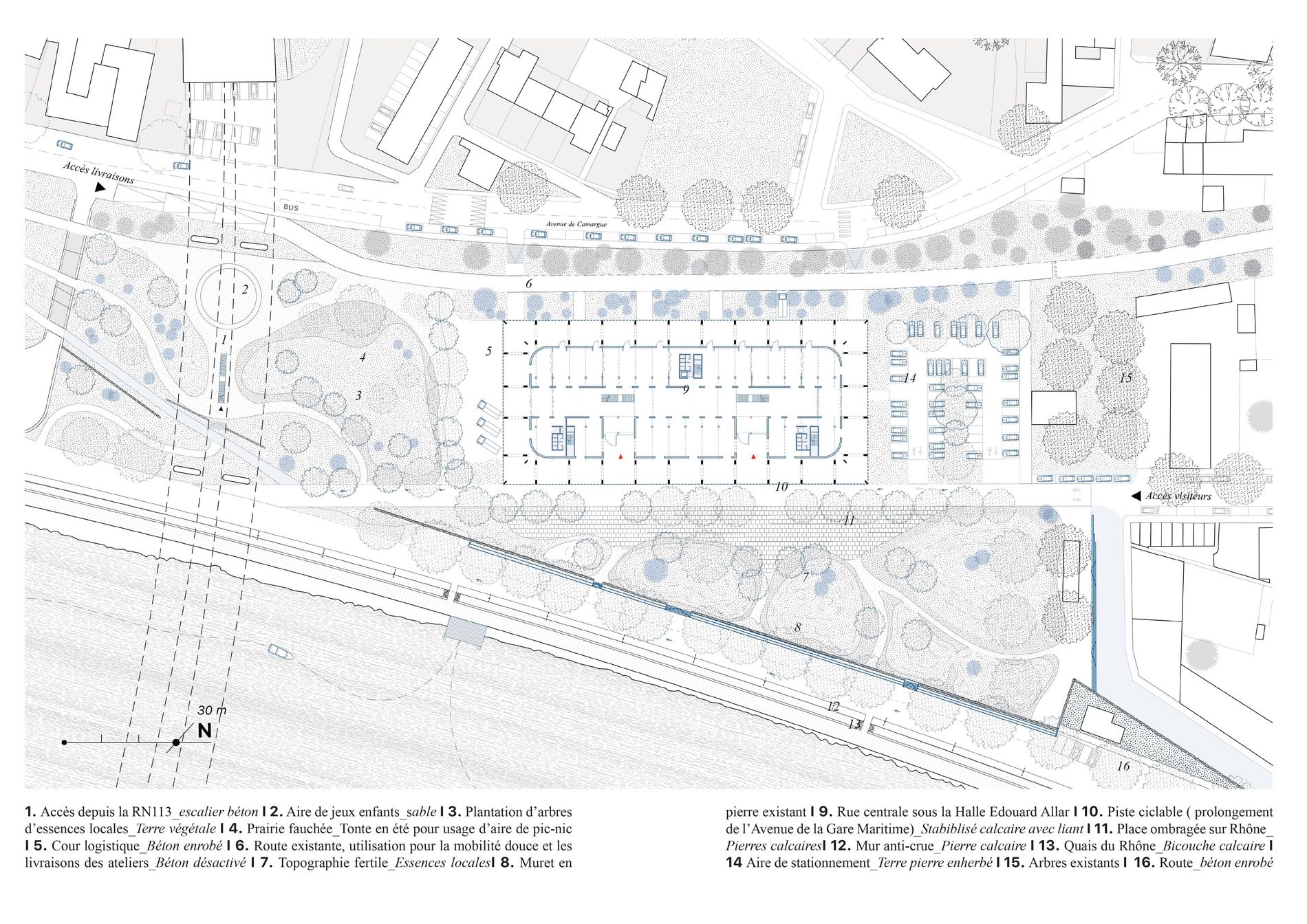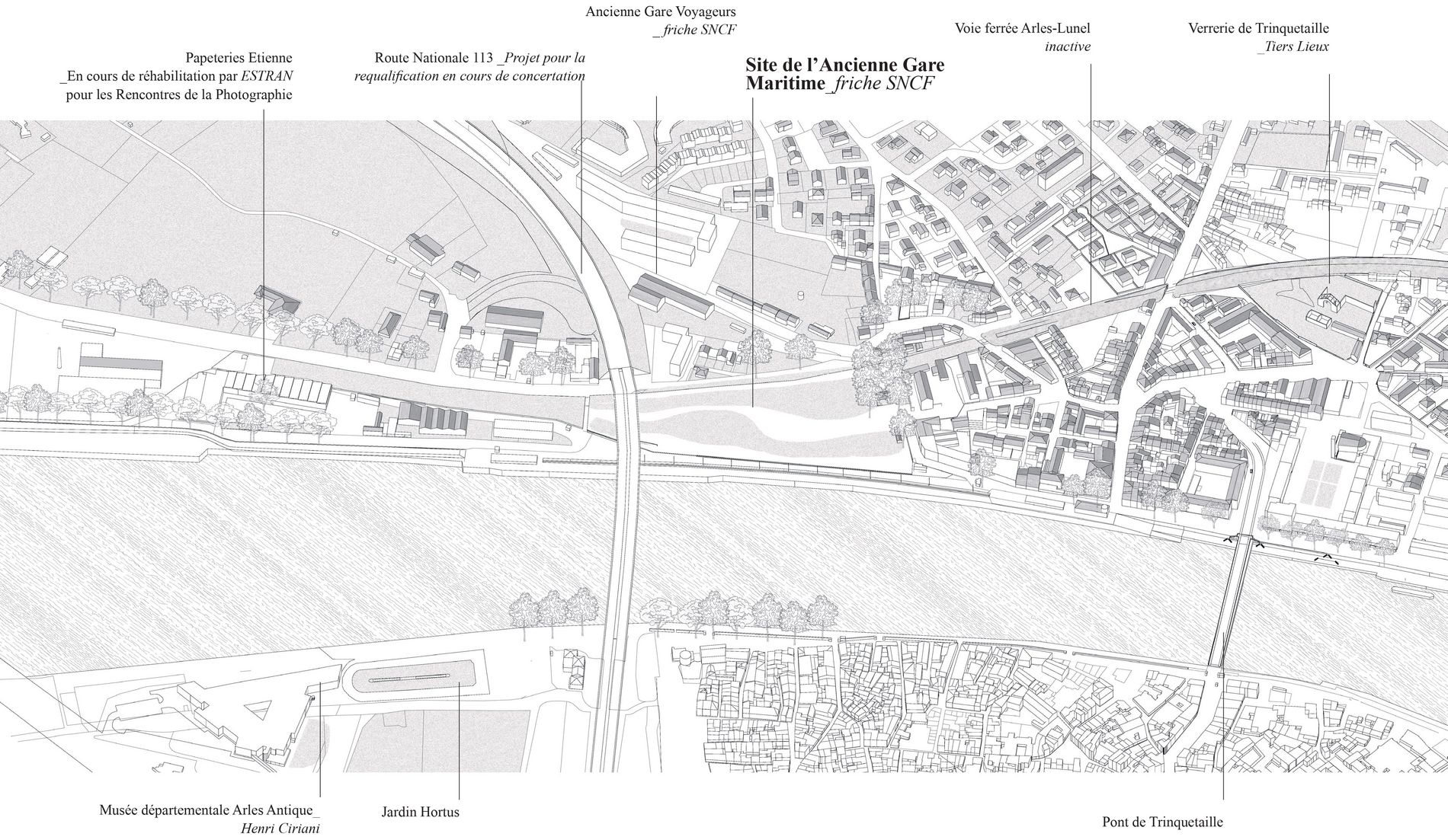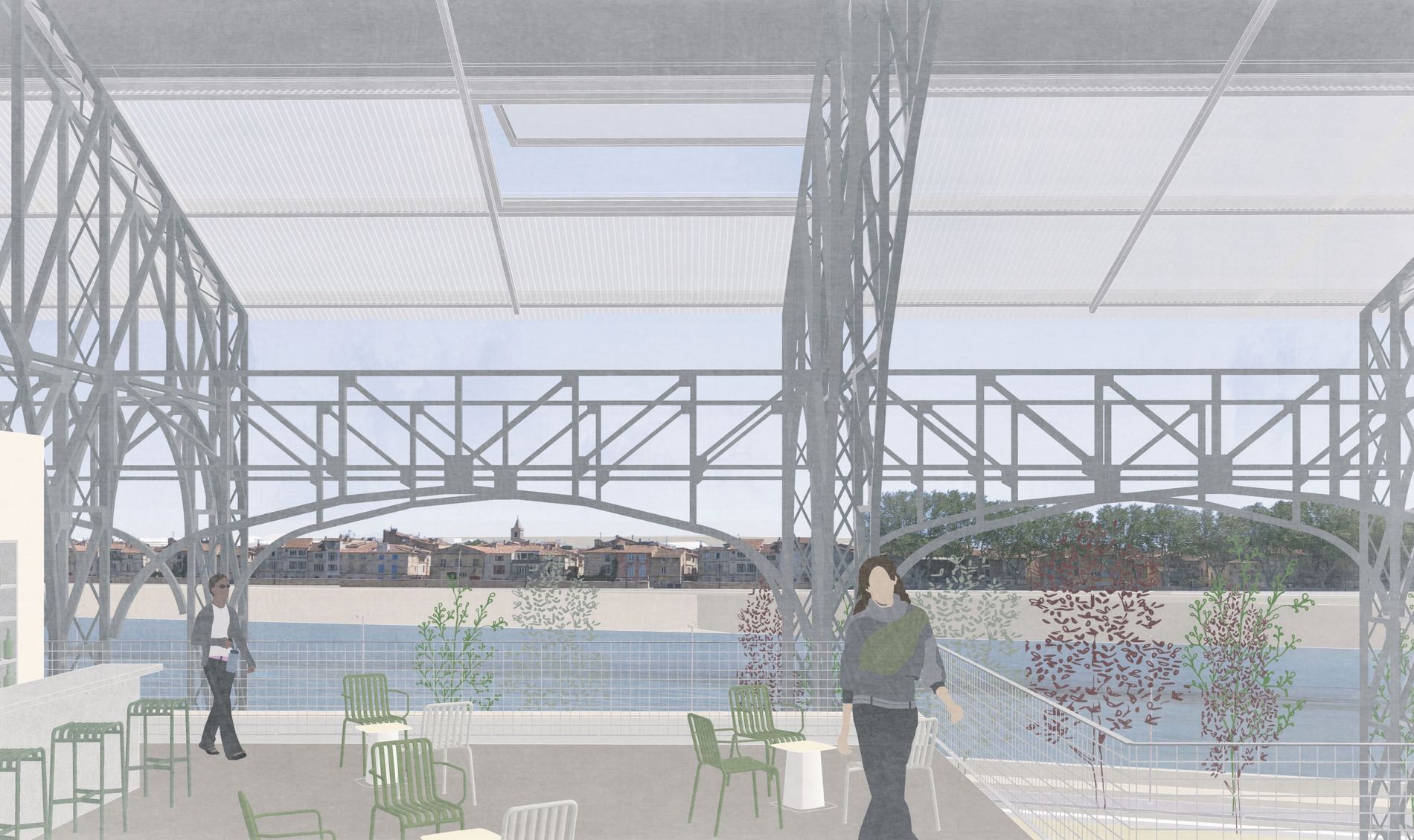 Convaincue de l’importance de “faire la ville sur la ville” plutôt que de l’étendre, le PFE s’attache la Rive Droite d’Arles, un territoire en pleine mutation. La friche de l’ancienne gare maritime de Trinquetaille, le long du Rhône, incarne l’opportunité d’une nouvelle centralité au travers de la transformation de l’infrastructure de la RN113. Au cœur du processus de projet s’inscrit la Halle Edouard Allar, une structure Eiffel singulière classée au Patrimoine du XXème siècle, démontée et laissée à l’abandon depuis 2018. Son remontage sur le site de la gare, associé à l’utilisation de matériaux locaux, permet de créer un nouvel emblème urbain, affirmant le rôle de Trinquetaille dans le rayonnement patrimonial et culturel d’Arles.