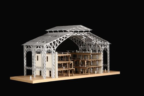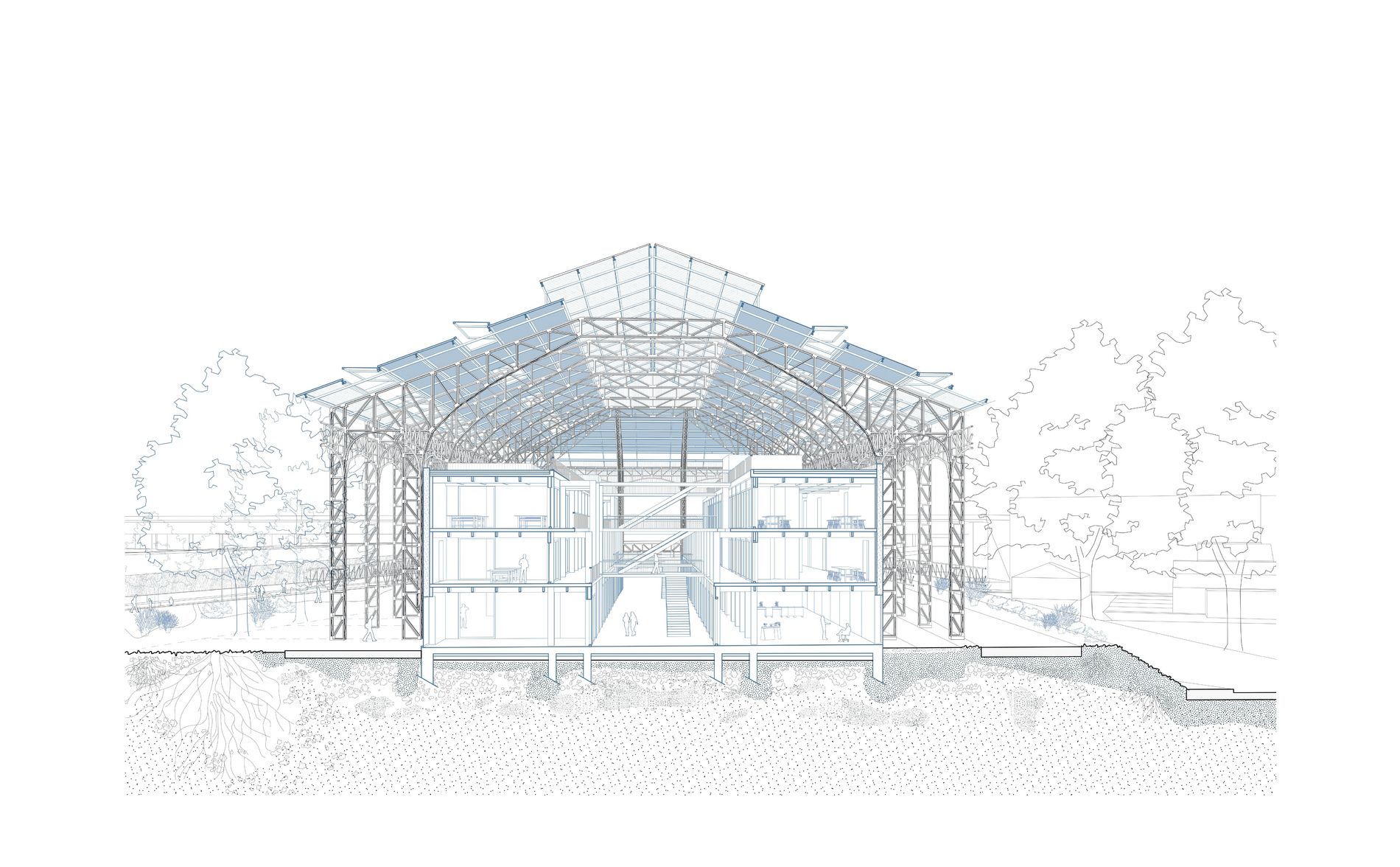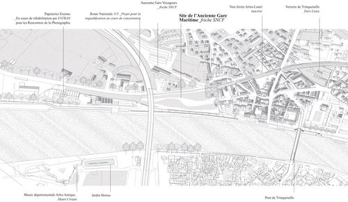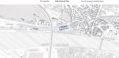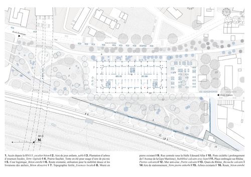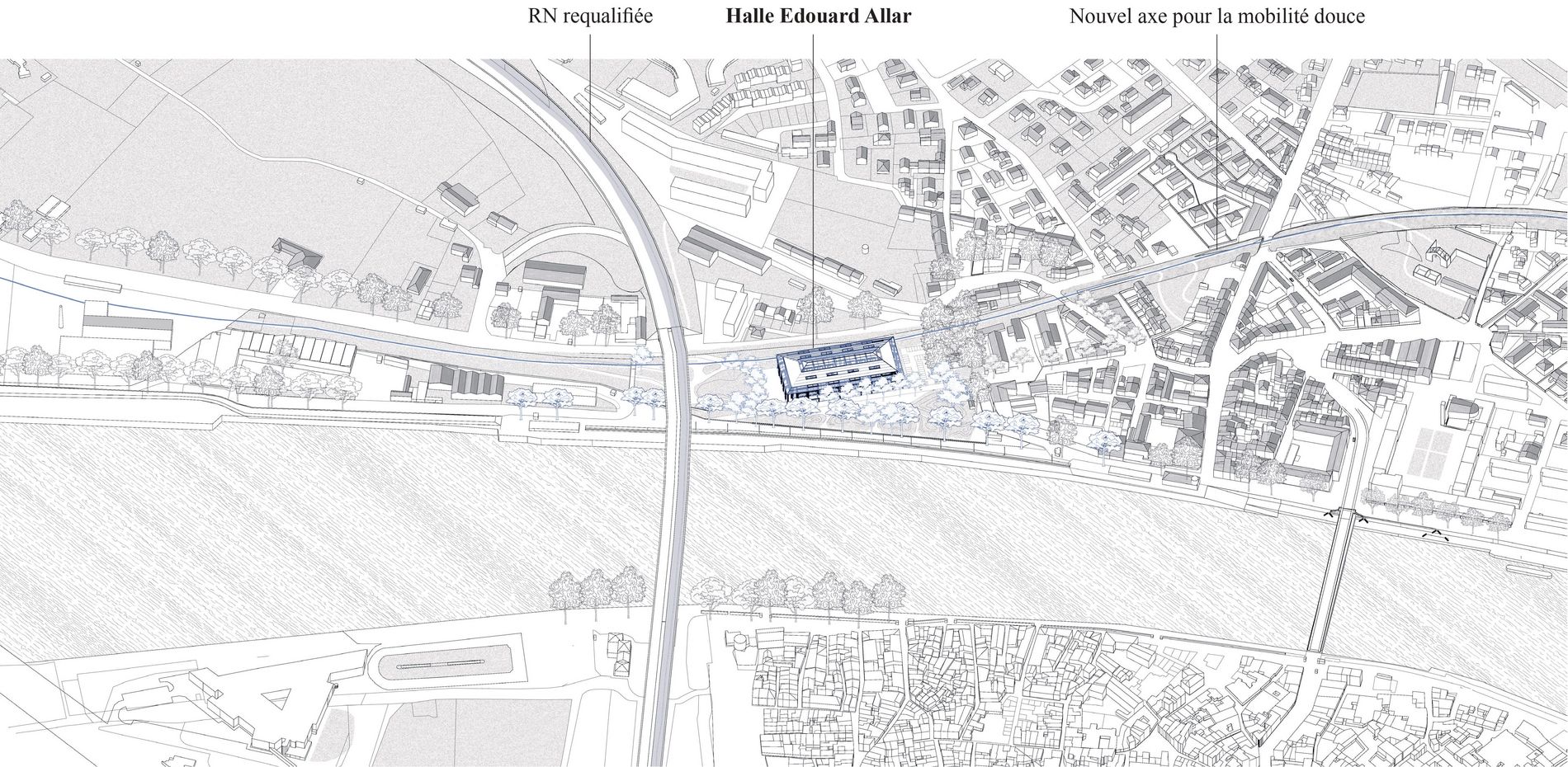 Convaincue de l’importance de “faire la ville sur la ville” plutôt que de l’étendre, le PFE s’attache la Rive Droite d’Arles, un territoire en pleine mutation. La friche de l’ancienne gare maritime de Trinquetaille, le long du Rhône, incarne l’opportunité d’une nouvelle centralité au travers de la transformation de l’infrastructure de la RN113. Au cœur du processus de projet s’inscrit la Halle Edouard Allar, une structure Eiffel singulière classée au Patrimoine du XXème siècle, démontée et laissée à l’abandon depuis 2018. Son remontage sur le site de la gare, associé à l’utilisation de matériaux locaux, permet de créer un nouvel emblème urbain, affirmant le rôle de Trinquetaille dans le rayonnement patrimonial et culturel d’Arles.