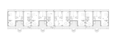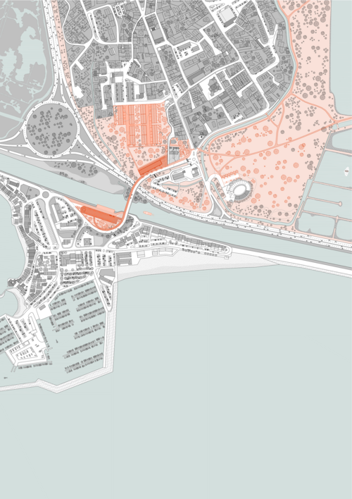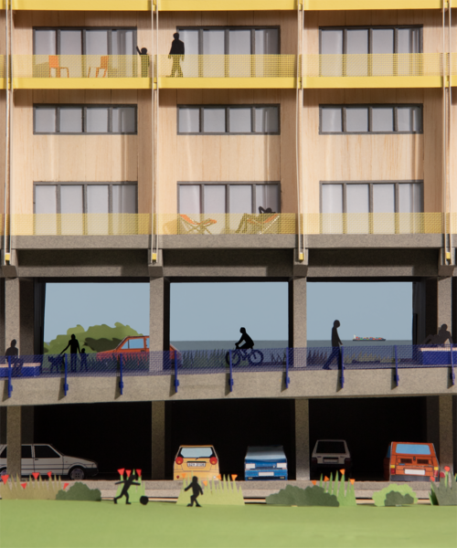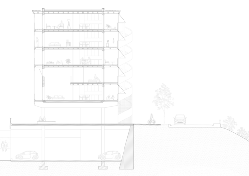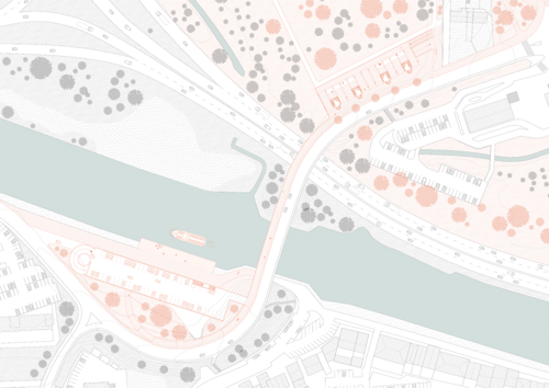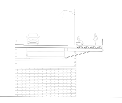 La nouvelle épaisseur imaginée se matérialise par une passerelle greffée à l'infrastructure et envisagée comme un espace public continu. Elle comprend deux dilatations bâties sous la forme de socles fonctionnels en béton, placés de part et d’autre dans l’épaisseur des talus de redescente du pont. Côté ville, le socle accueille du parking en sous-sol et délimite, en suivant la descente de la route, un espace public en extension du trottoir existant. Par-dessus, un volume en structure bois permet la fabrique de logements traversants, organisés selon les trames du socle. Côté canal, le deuxième socle accueille un espace de rencontre multimodale, et permet grâce à sa structure d'envisager une réversibilité future.