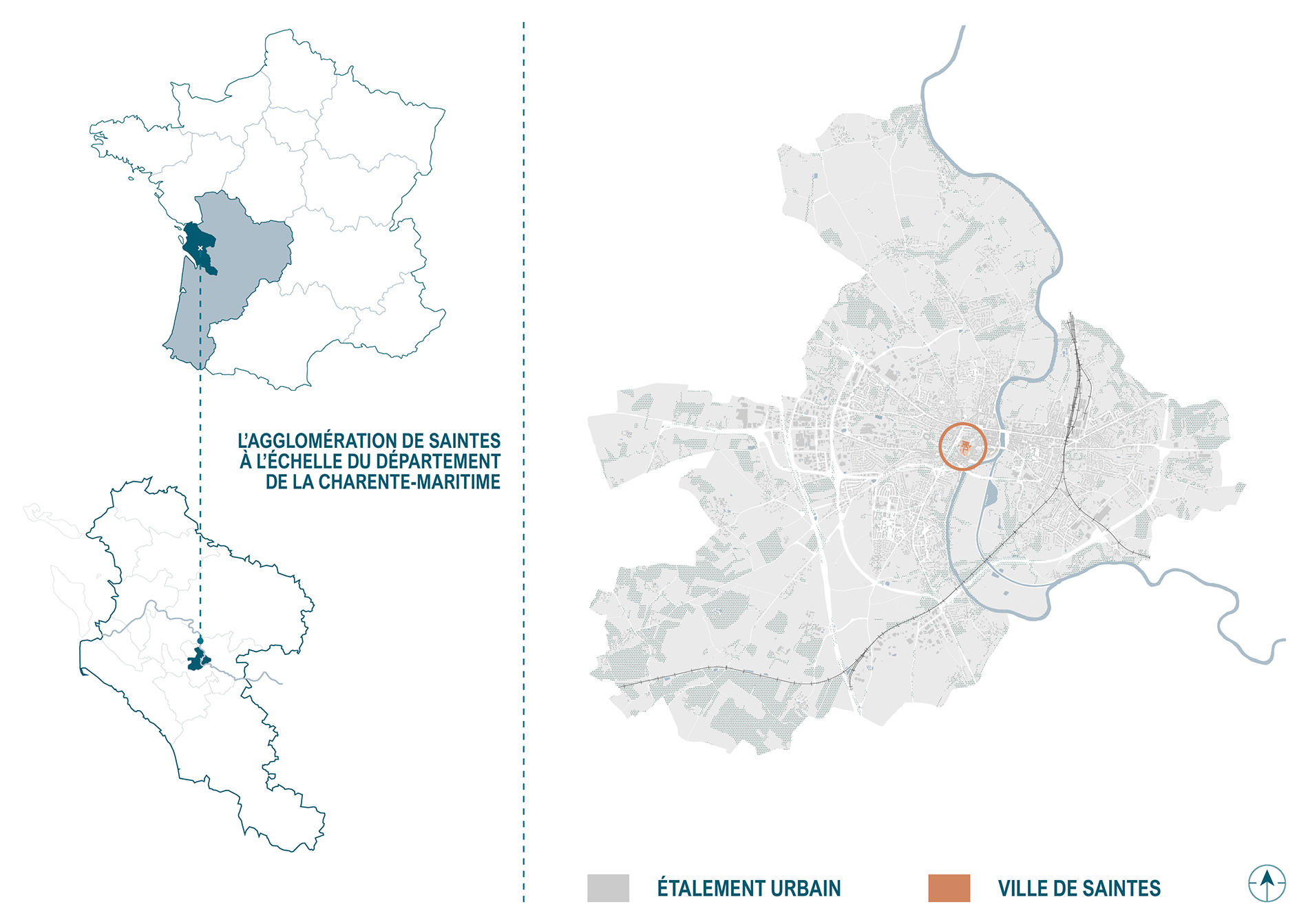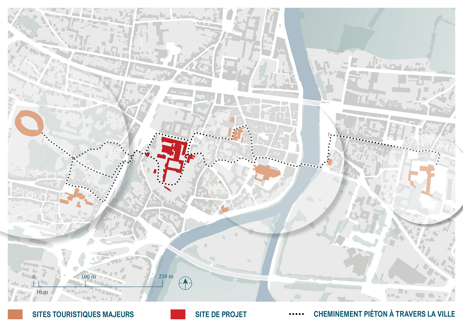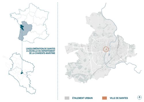Le projet de transformation de l’ancien hôpital Saint-Louis est situé à proximité du centre ville de Saintes, sur un terrain caractérisé par un promontoire rocheux. Cet avantage topographique offre un panorama exceptionnel, élargit à 360° sur la ville et son territoire. Pourtant, ce lieu stratégique, marqué par la présence de nombreux vestiges antiques, demeure sans véritable affectation, se réduisant depuis 2007 à un point d’étape succinct dans la promenade qui relie le centre-ville à l’amphithéâtre gallo-romain. Ce déficit nuit à la continuité des parcours et à une logique touristique basée sur la mise en valeur des richesses archéologiques.