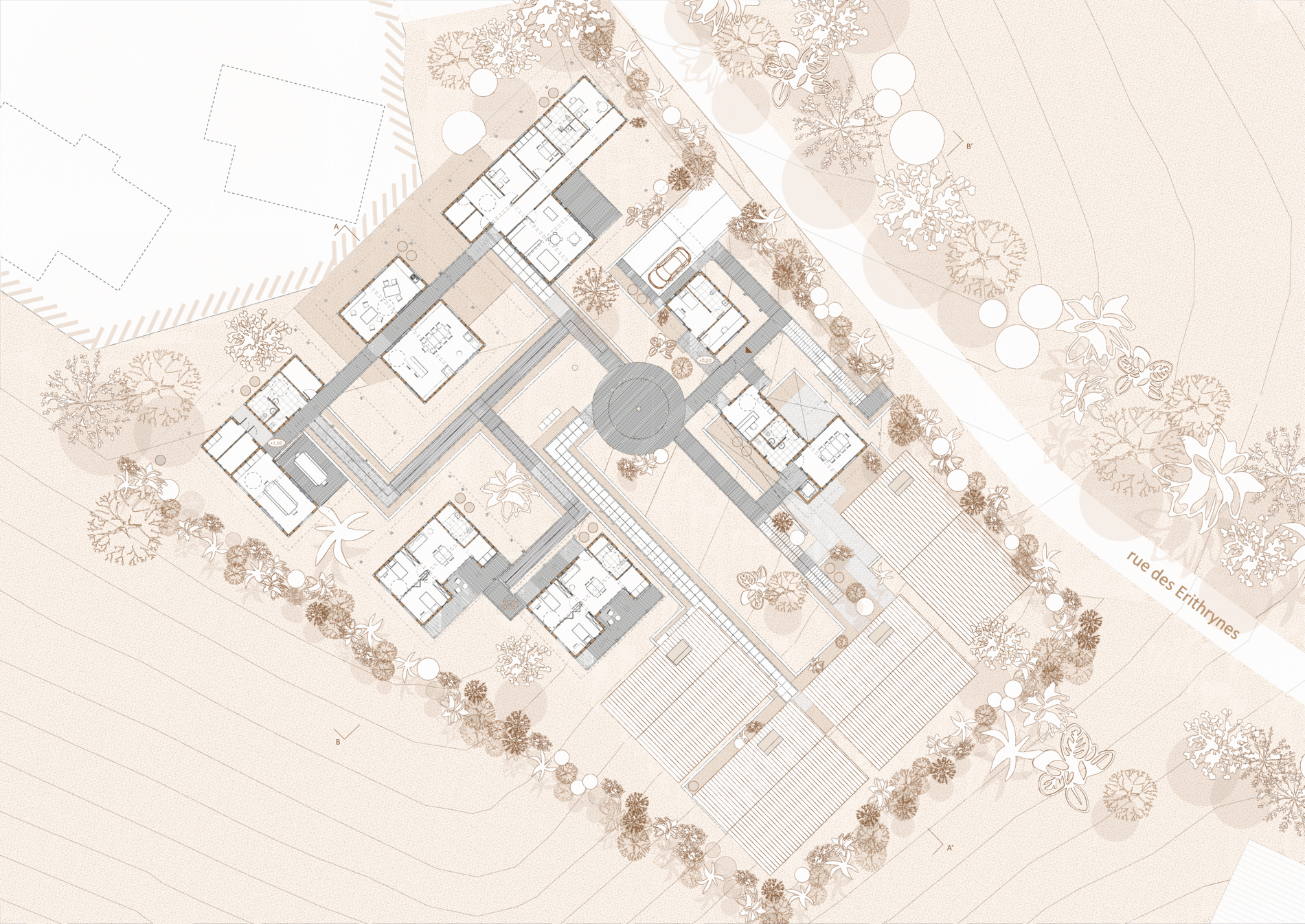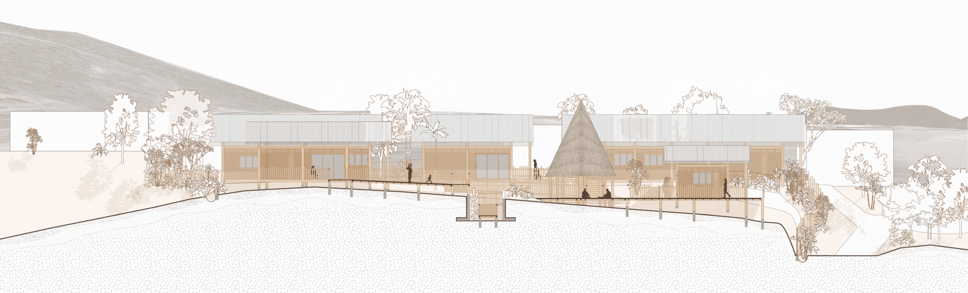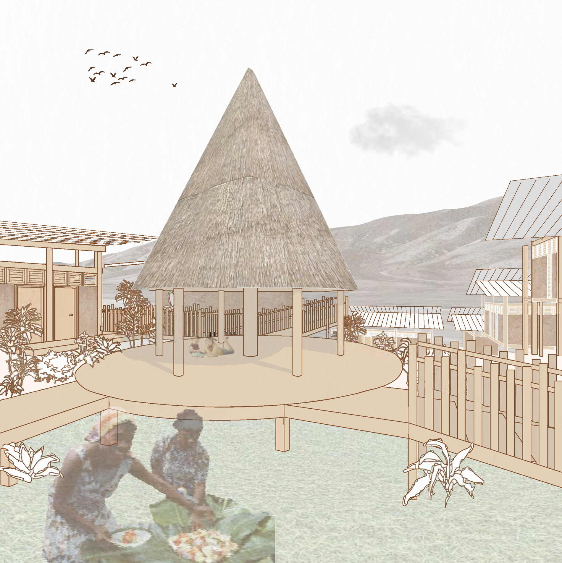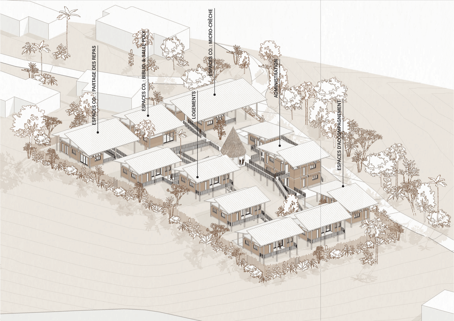 Ce projet de fin d'études porte sur la conception d'un centre d'hébergement et d'accompagnement destiné aux femmes victimes de violences intrafamiliales et leurs enfants en Nouvelle-Calédonie, qui figure parmi les territoires français les plus touchés par cette problématique. Il est implanté à Bourail, sur un site entouré de montagnes, en lisière de village et à proximité immédiate des commodités. Le projet reprend des logiques d'implantation vernaculaires et s'organise autour d'un faré - abri couvert extérieur et polyvalent - qui occupe une place centrale. Ce dernier constitue un espace de parole et de partage, liant les différents espaces du centre. L'enjeu a été de proposer un cadre rassurant et fonctionnel, adapté aux modes de vie locaux et aux besoins spécifiques des occupantes, tout en intégrant l'emploi de ressources locales comme le bois et le torchis, ainsi que des dispositifs passifs et actifs favorisant notamment le confort thermique. Ce projet propose un modèle reproductible pour répondre à un besoin criant sur l'ensemble du territoire, et il est pensé à la fois pour l'accueil d'urgence et l'accompagnement sur la durée, pour une reconstruction d'une vie après le centre stable et seine.