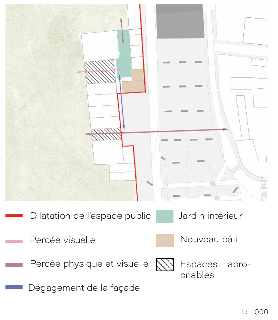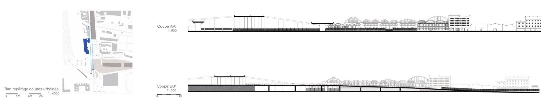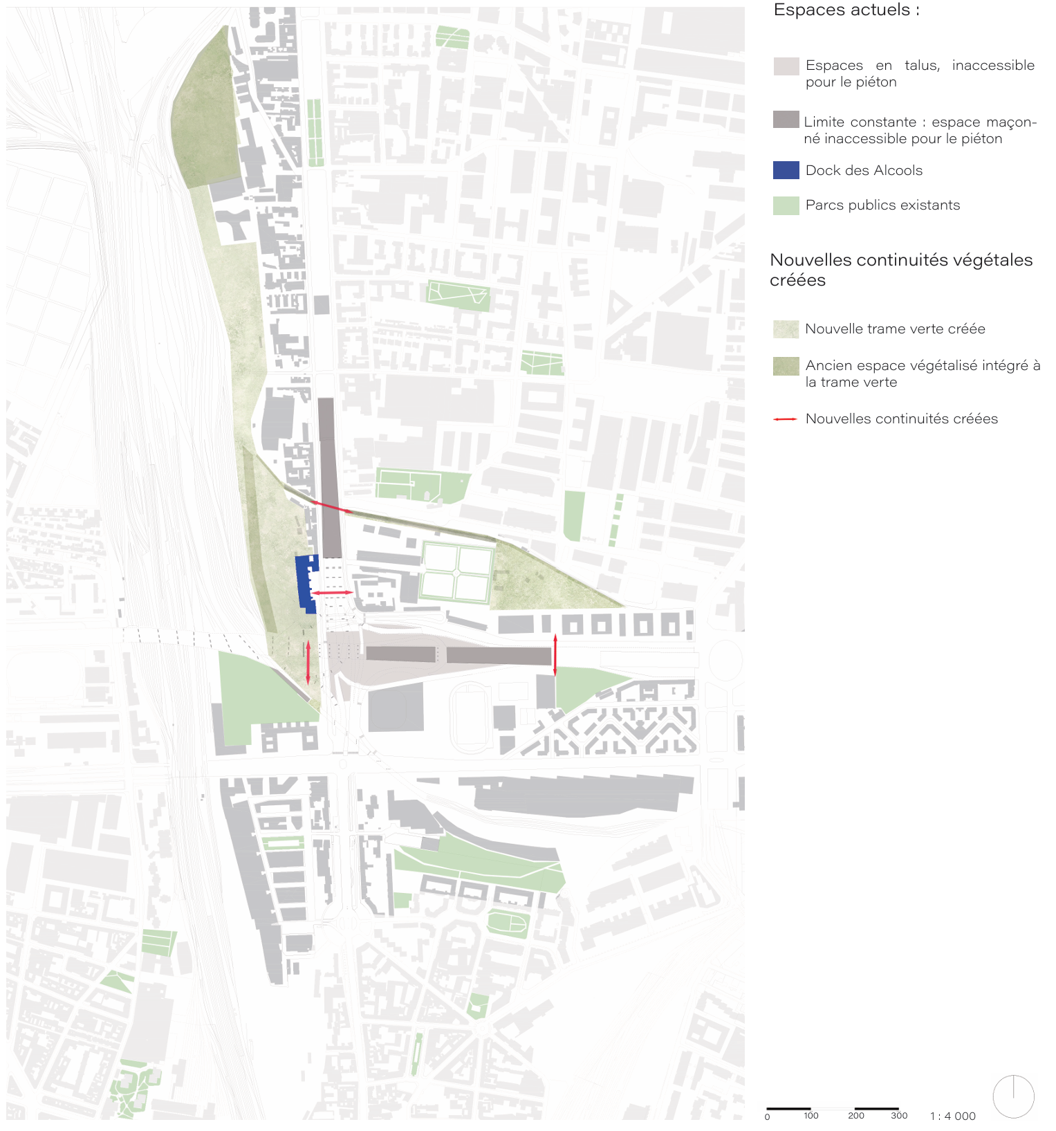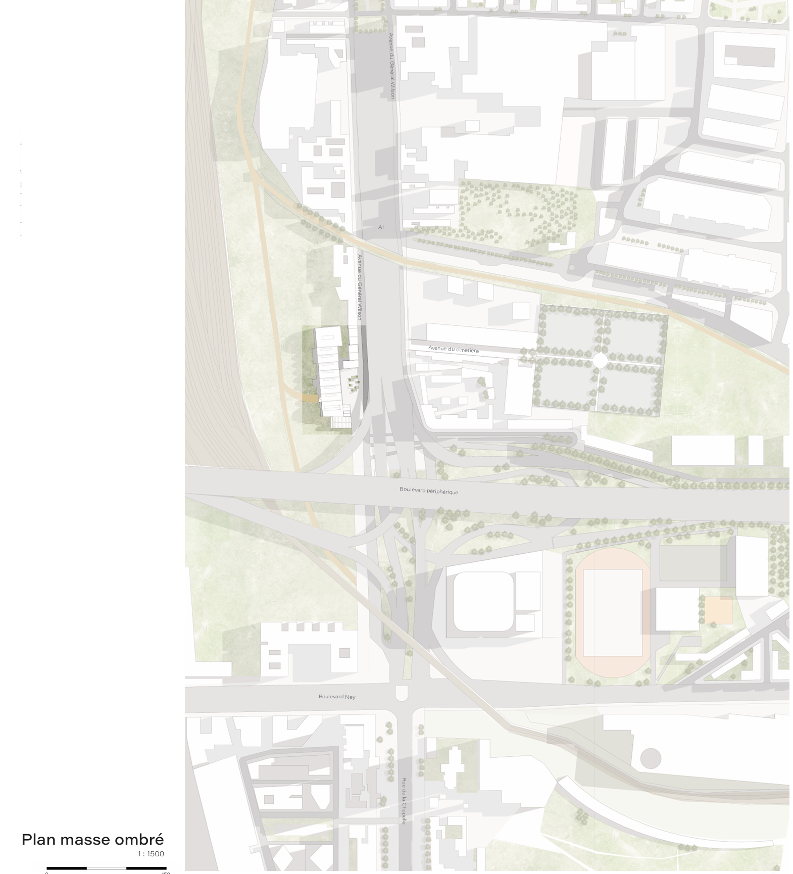 La Porte de la Chapelle, longtemps marquée par l’enclavement et le trafic, connaît aujourd’hui une transformation portée par l’élan des Jeux Olympiques. Le plan guide propose de recoudre ce territoire fragmenté grâce à une trame verte, favorisant l’accessibilité, les circulations douces et la mise en relation d’espaces auparavant isolés. Au croisement du périphérique et de cette nouvelle continuité, le Dock des Alcools incarne la mémoire industrielle par son architecture de béton et brique. Sa réhabilitation en lieu hybride d’apprentissage, de sport et de rencontres s’inscrit dans une dynamique de valorisation urbaine et sociale. Mon intervention vise à effacer les clôtures et obstacles, à creuser des percées visuelles et à créer un parvis, afin de retisser des liens entre ville, infrastructures et paysage. Le projet articule ainsi héritage industriel et nouveaux usages, en affirmant une architecture ouverte et poreuse.