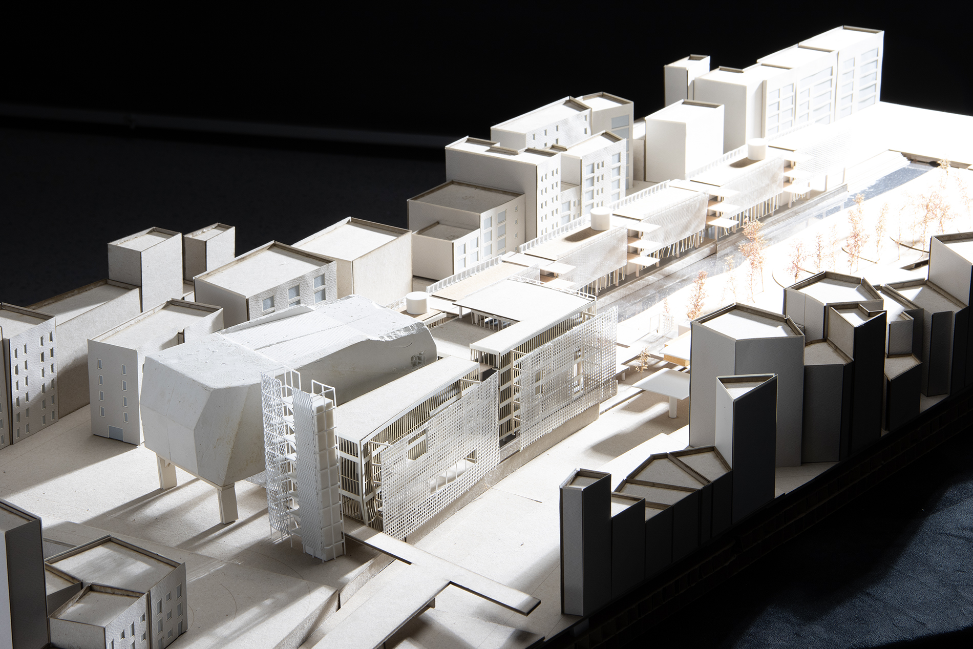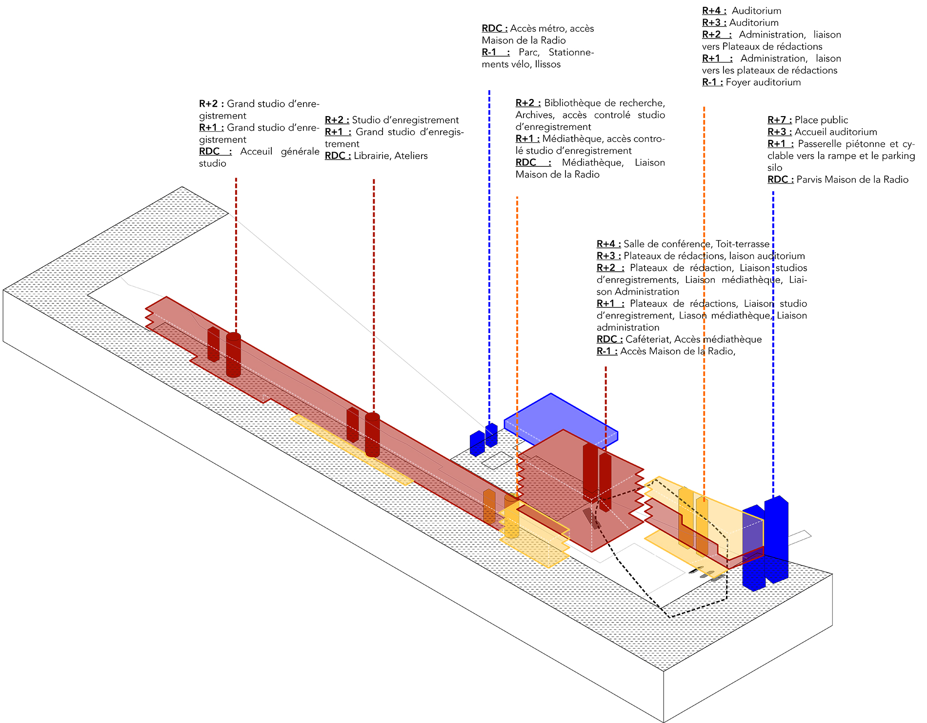 La Maison de la Radio, implantée au coeur de ce dispositif, joue un rôle structurant : elle capte les dynamiques du site, recompose les circulations et devient un lieu de médiation entre ville, paysage et information. En cela, le projet tente de répondre à une double ambition : reconstruire un lien avec un territoire oublié et offrir un cadre de vie plus résilient et inclusif pour les générations futures.