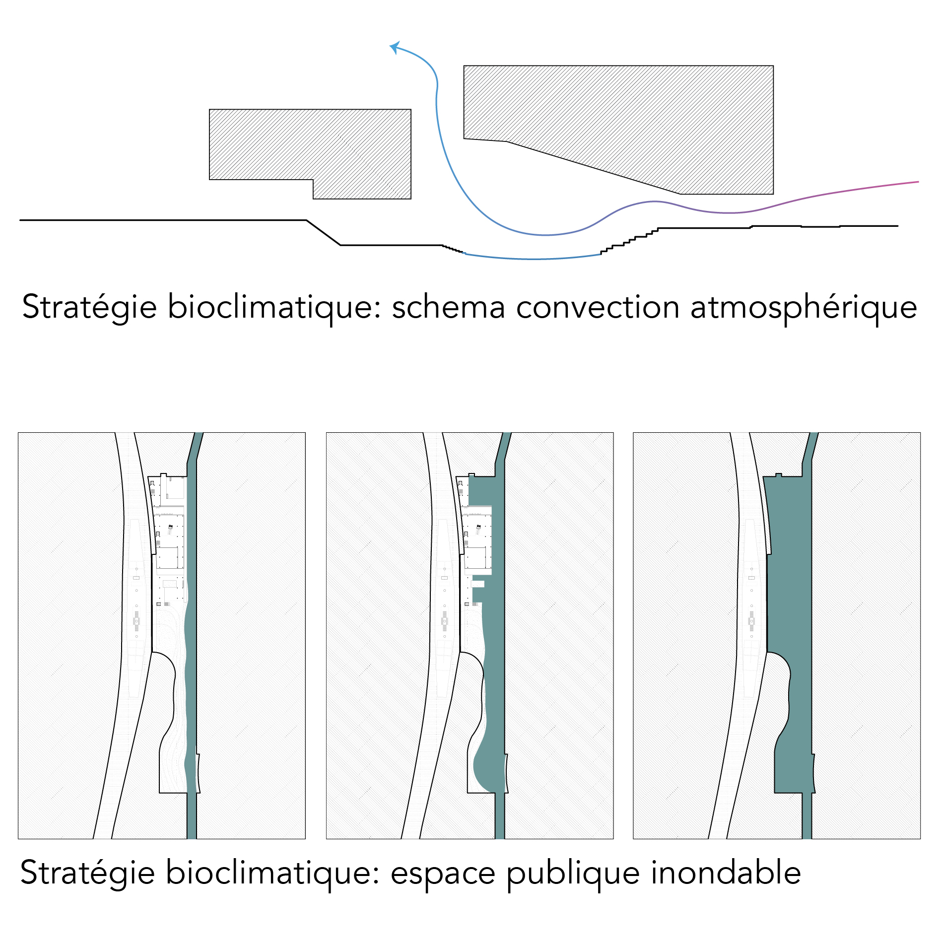 Plutôt que de tenter une restitution purement naturaliste, le projet propose une reconstruction symbolique et fonctionnelle de la rivière, en intégrant ses flux dans une nouvelle stratification urbaine. Loin d’un geste nostalgique, il s’agit ici de requalifier un espace longtemps dominé par la voiture en y réintroduisant le vivant, les mobilités douces, et des usages publics.