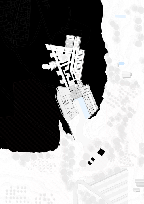 Ce projet est en lien direct avec mon mémoire sur l’insertion des architectures dans la pente. L’enjeu principal est de relier deux ensembles de ruines longtemps séparés par une route départementale, en retrouvant la continuité originelle du site.