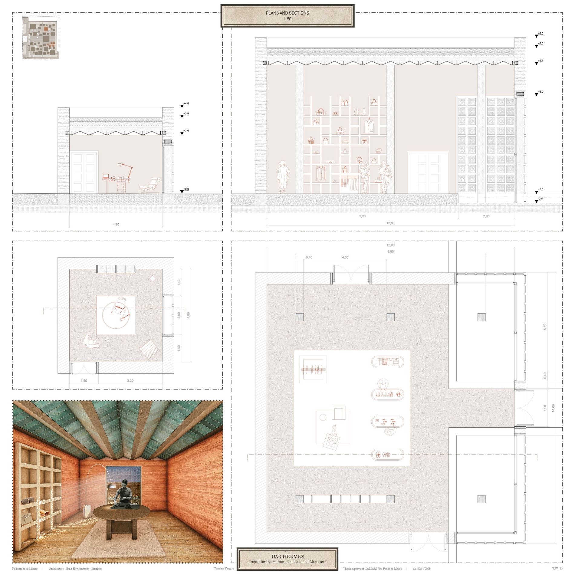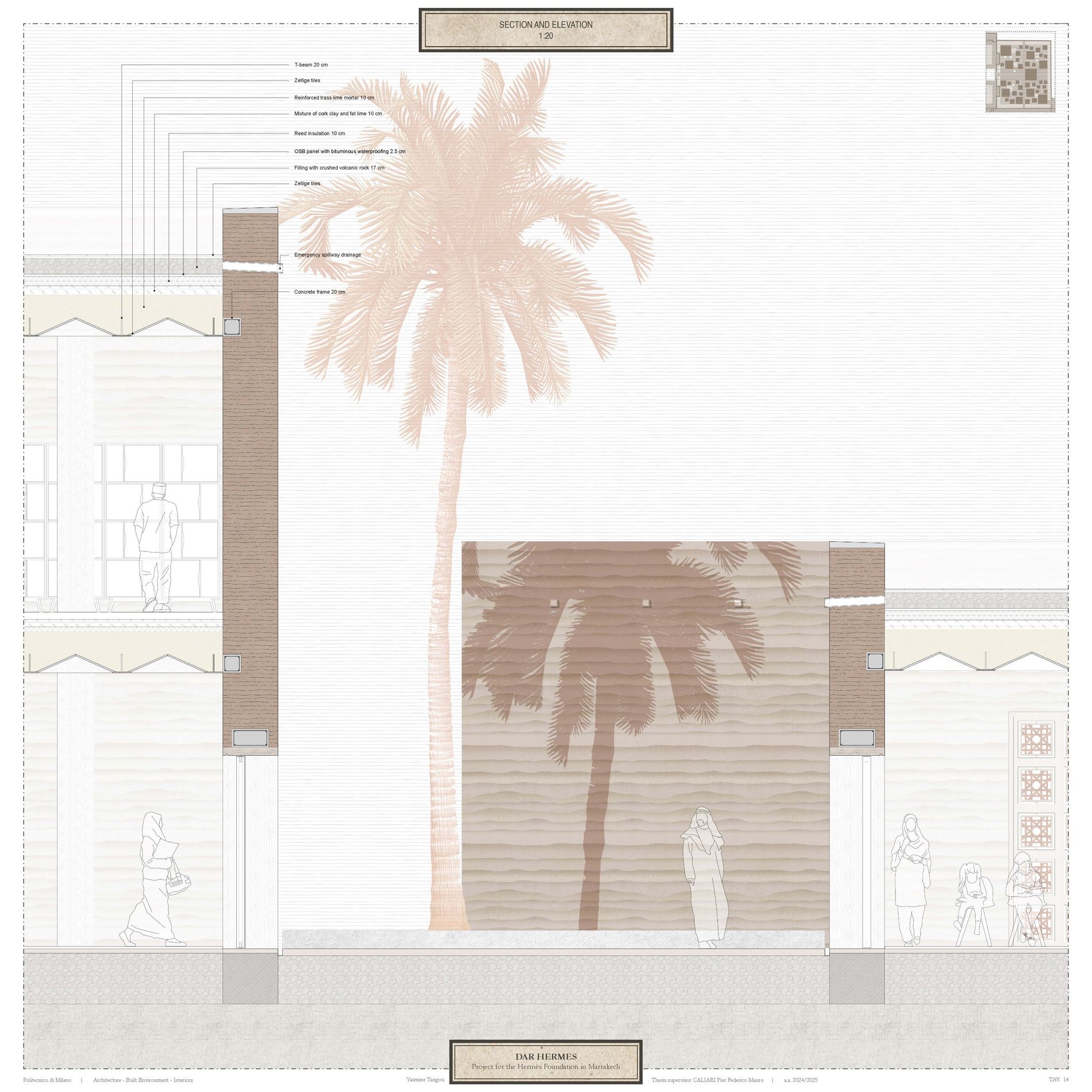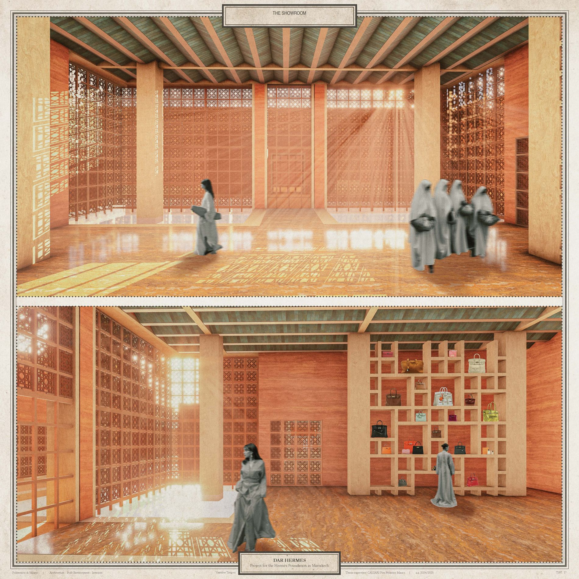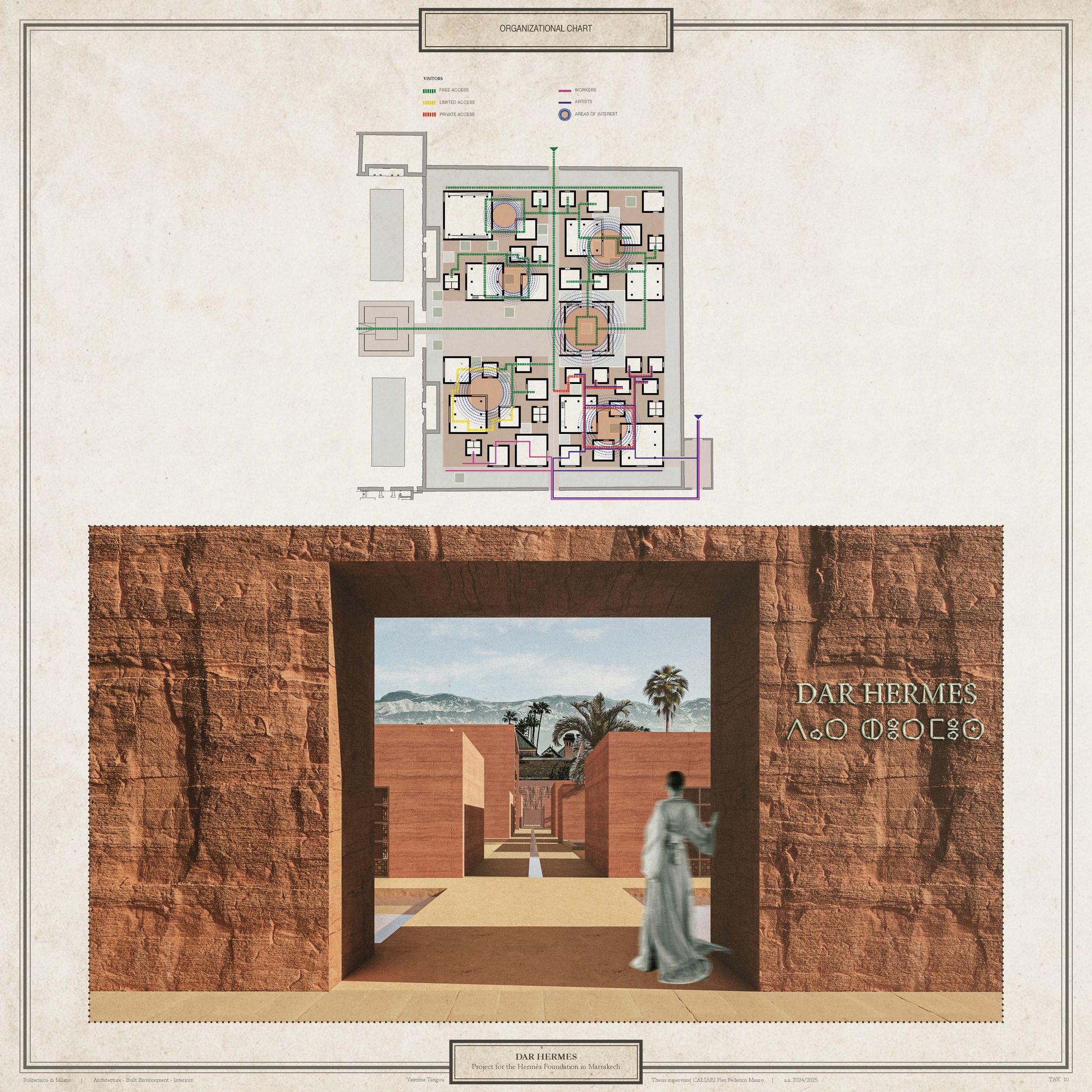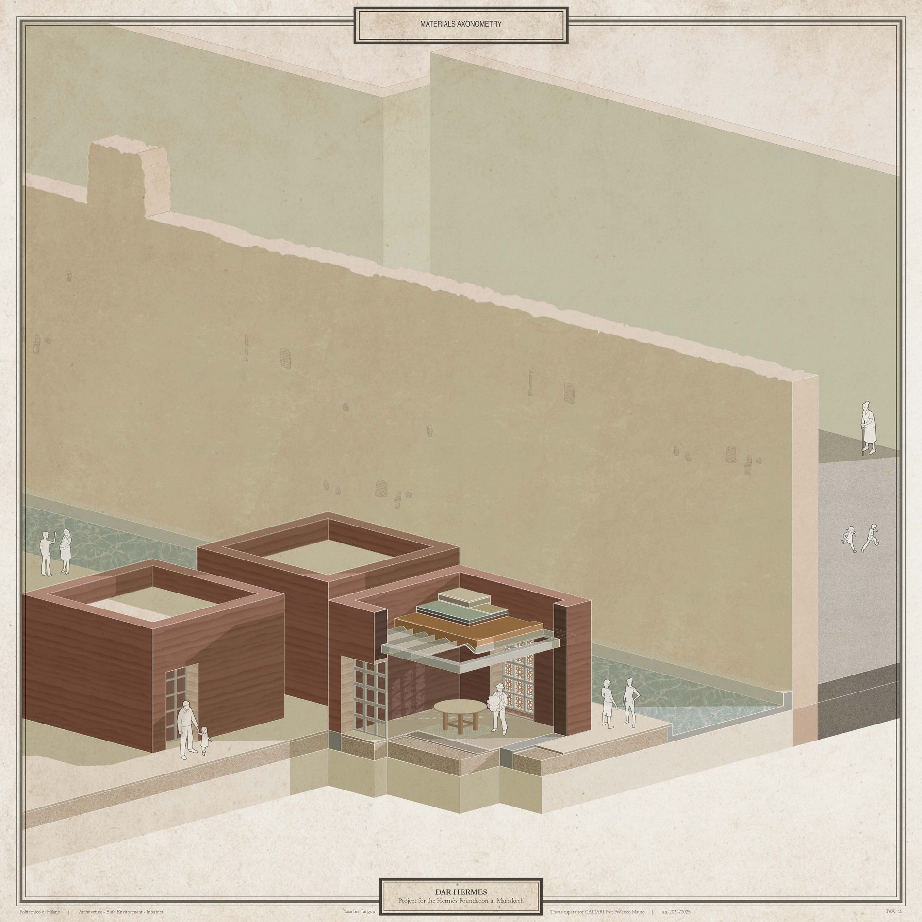 Le projet propose la réutilisation adaptative du palais El Badi comme fondation culturelle pour Hermes, un espace où le savoir, la spiritualité, l’artisanat et le dialogue interculturel pourraient refleurir. À travers des propositions architecturales intégrant l’apprentissage interactif, les arts traditionnels du cuir, des espaces de contemplation, le projet envisage une réactivation du palais répondant à la fois aux besoins locaux et aux défis globaux. Ce faisant, il défend une stratégie patrimoniale qui remet les communautés au centre et transforme les édifices historiques en espaces vivants de continuité, de création et de résilience culturelle. Le projet s’appuie également sur l’utilisation de matériaux vernaculaires, tels que la terre rouge, et sur un langage architectural qui traduit de manière contemporaine les compositions typiques de la médina et de la maison marocaine.